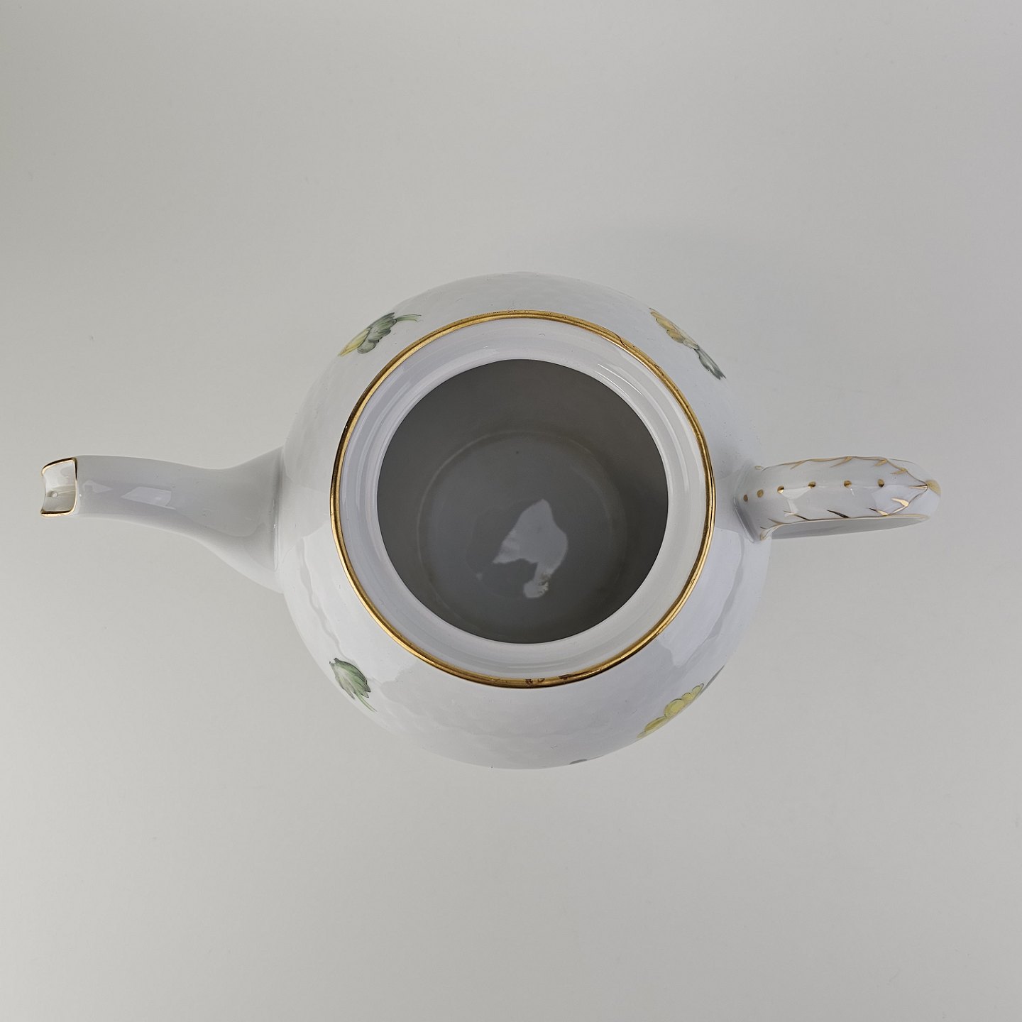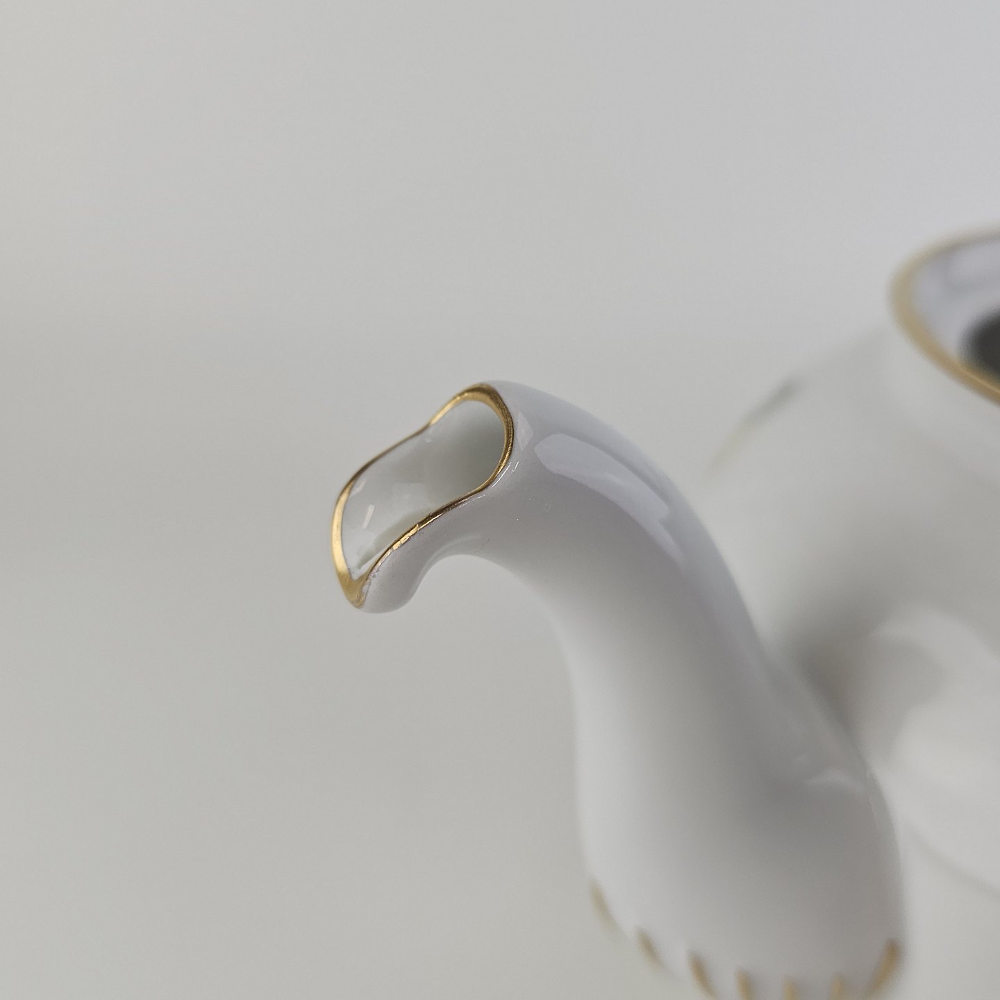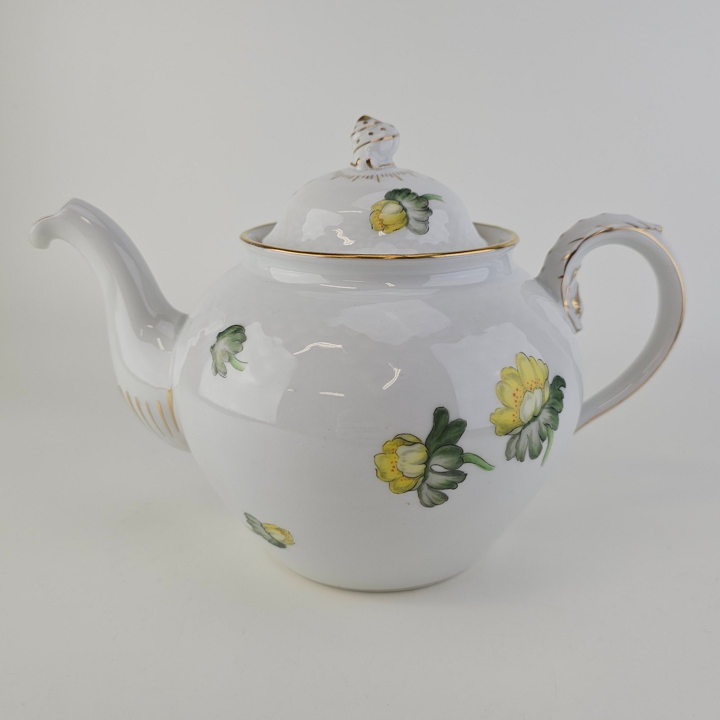 Hvidt porcelæn i skælform med dekoration af gule blomster og guldkant