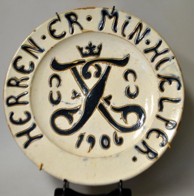 Dansk keramiker (1906): Mindeplatte for Frederik VIIIs tronbestigelse, 1906. Med blå og hvid glasur. Med Frederik VIII monogram og valgsprog: Herren er min hjælper. Dia: 28 cm.