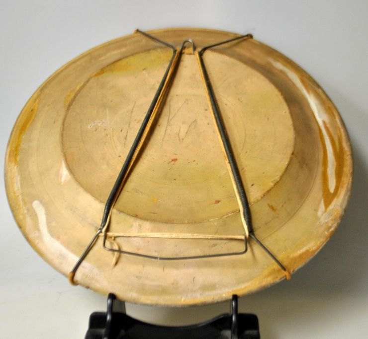 Dansk keramiker (1906): Mindeplatte i keramik for Chr. IX (1863-1906), 1906. Hvid, blå og gul glasur. Med Chr. IX monogram og valgsprog: Med Gud for ret og ære. Dia: 27,5 cm.