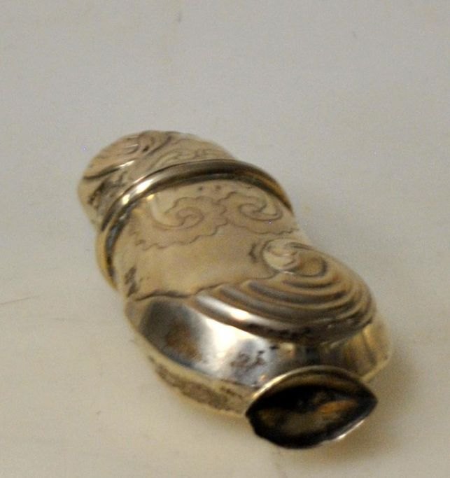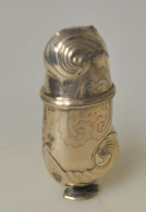 Rococo hovedvandsæg i sølv, 18. årh. Danmark. Med udvendige rococo dekorationer. Indvendig lueforgyldt. Ustemplet. H.: 7,5 cm. På nyere oval fod.