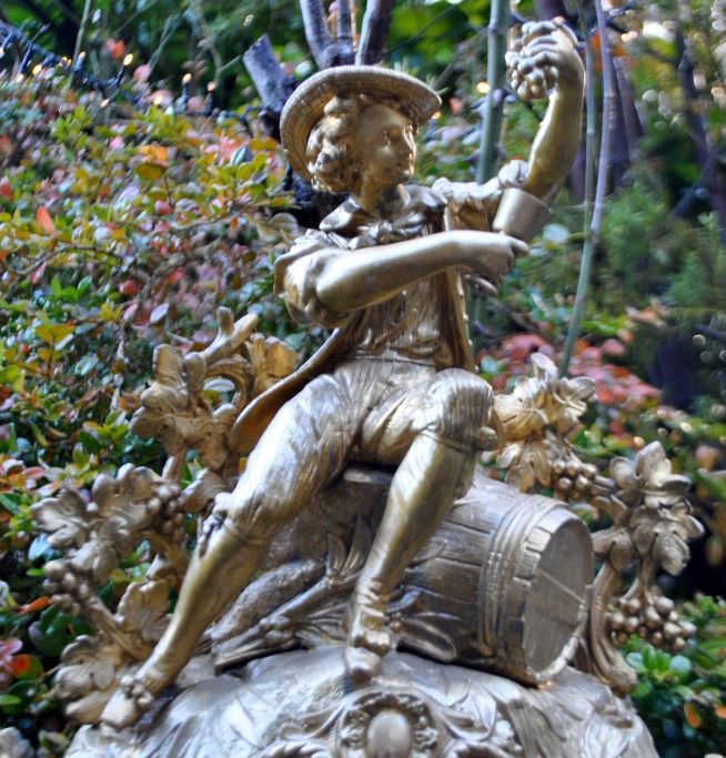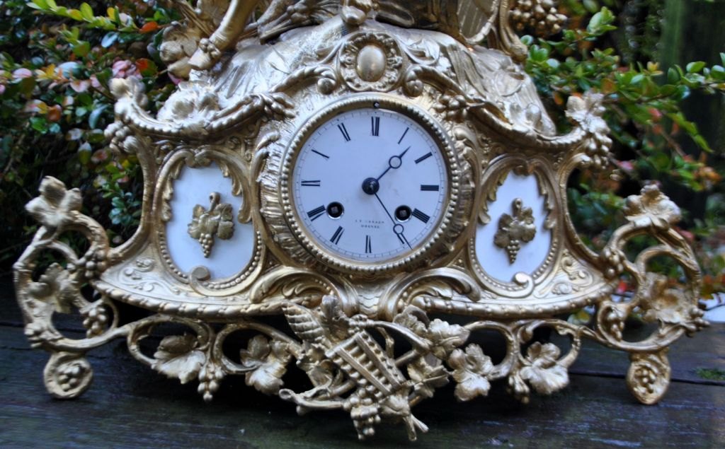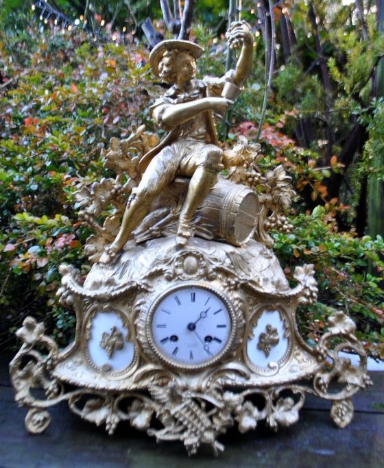 Bronzeret zinkur, ca. 1870, Frankrig. Hovedfigur af ung mand, der sidder ovenpå en tønde med et krus. Hele uret dekoreret med vinløv og druer. Hvidemaljeret skive med romertal. Skive signeret: J. A, Hansen, Odense. H. 45 cm. B.: 42 cm. D.: 12 cm.