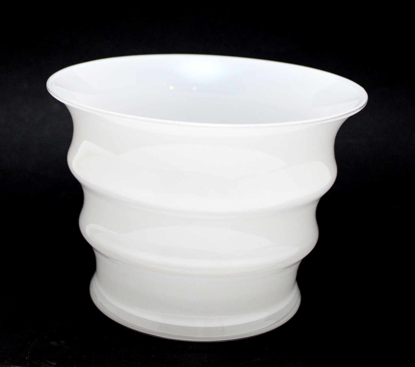 Holmegaard, Karen Blixen, Mellemstor urtepotteskjuler i opalhvid. Designet af Anja Kjær fra 2000. Højde 10,5 cm. Diameter 15 cm. Pris: 375 kr. stk. Lager: 1