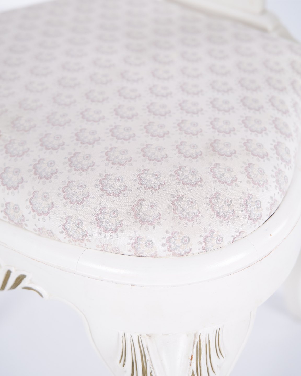 Antikke spisebordsstole i ny rokoko stil fra 1920’erne. Sæt af 6 hvidmalede stole med dekorative detaljer.