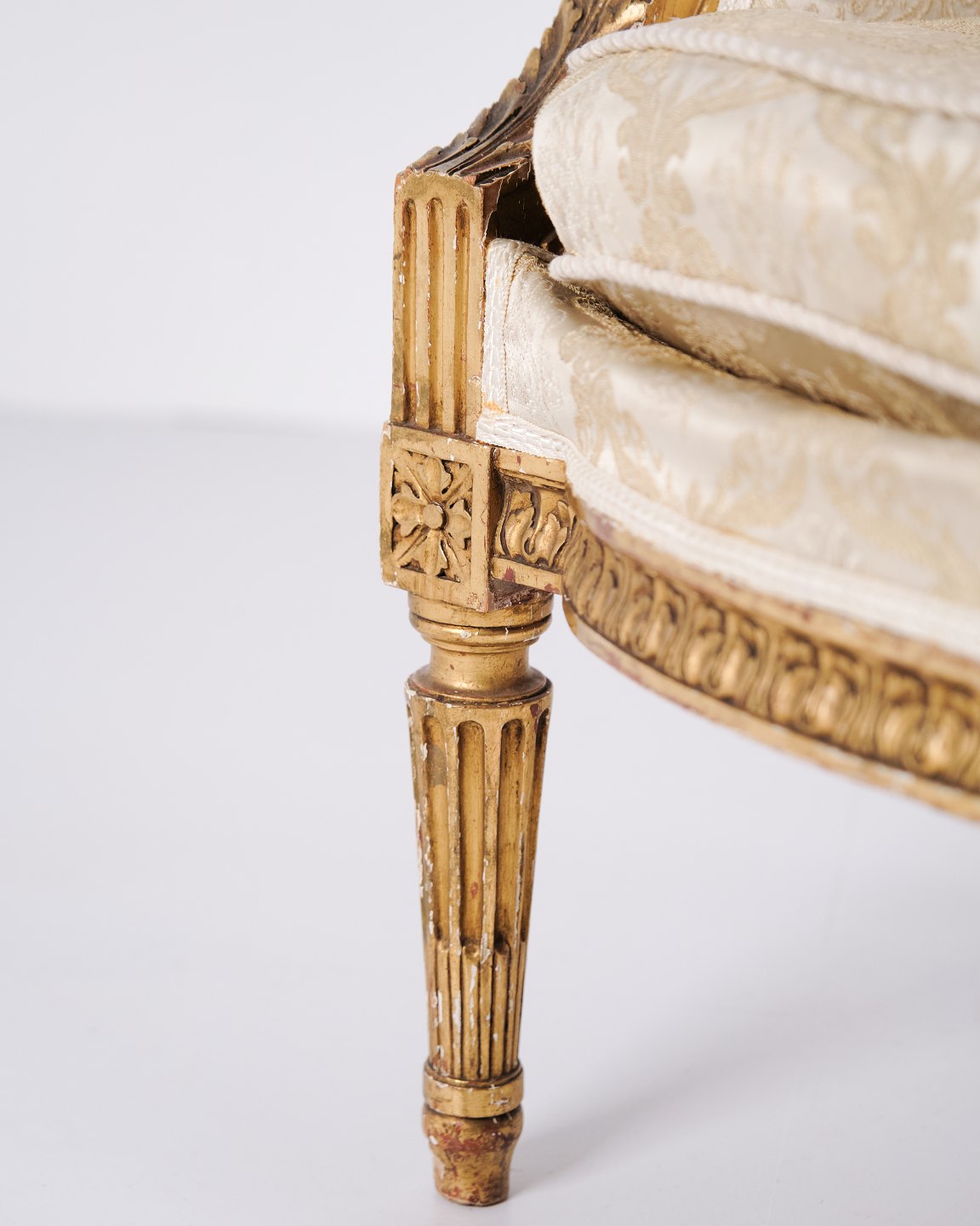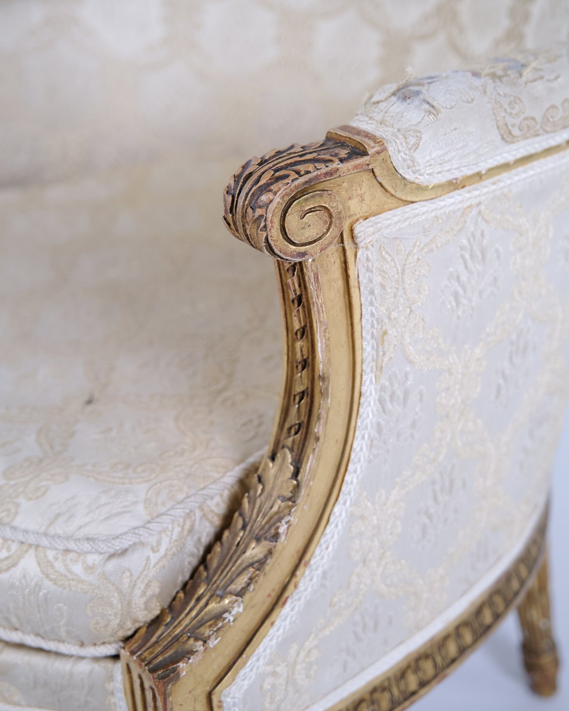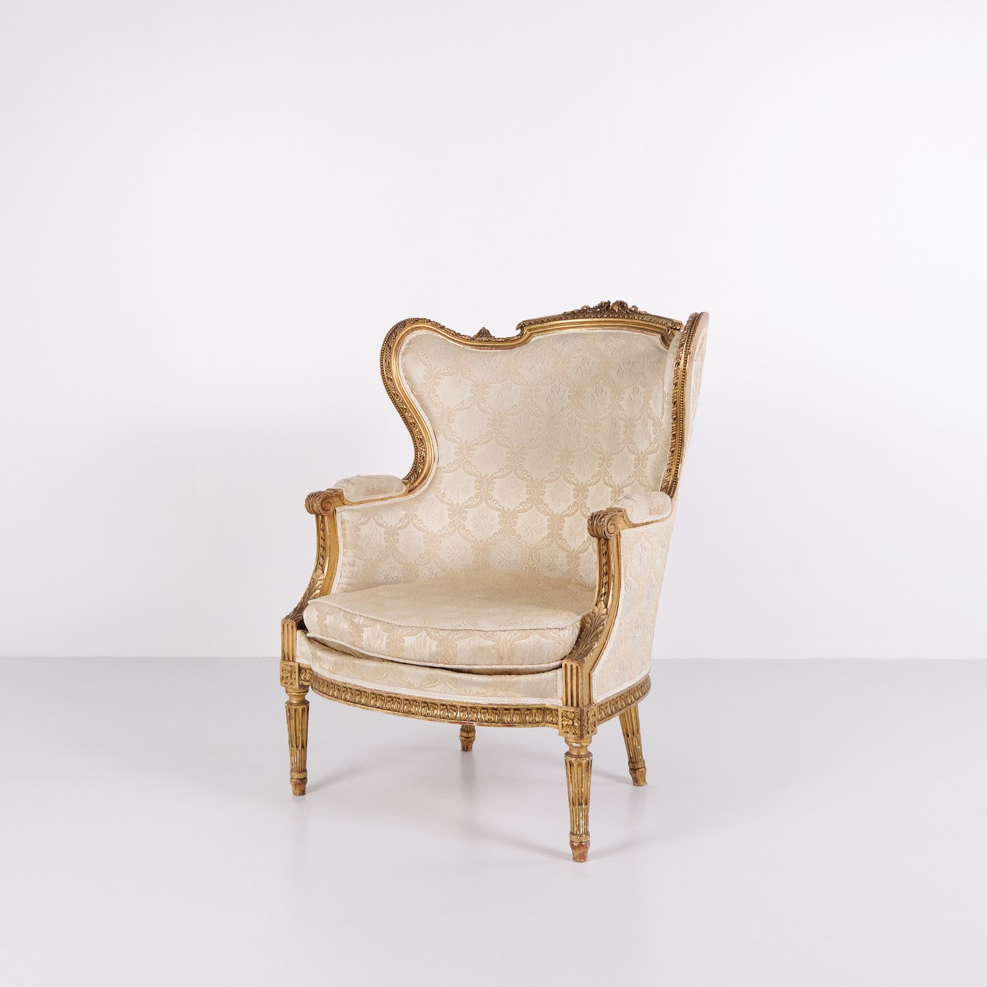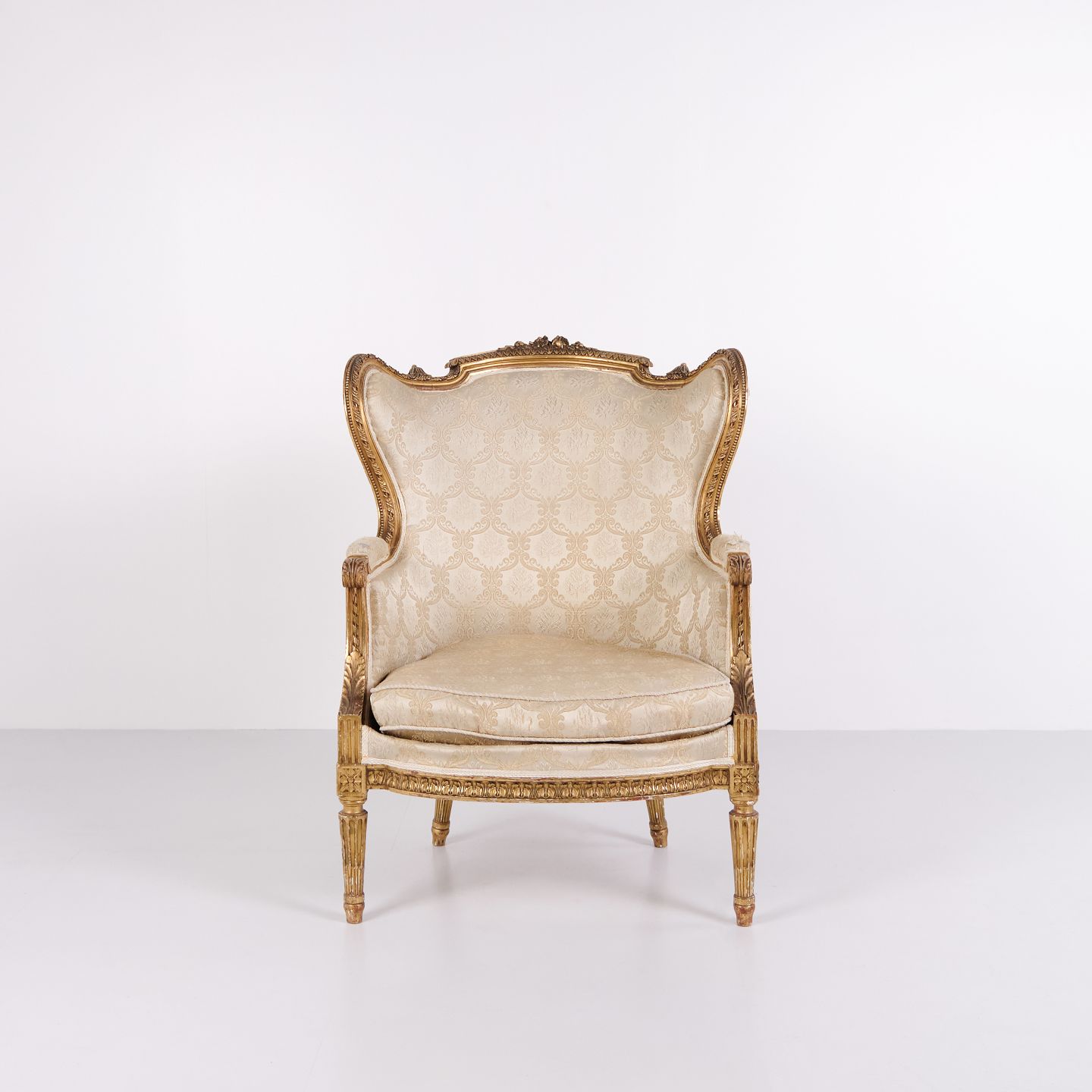 Antik bergère lænestol 1860’erne i Louis XVI stil. Forgyldt træ og lyst polster.