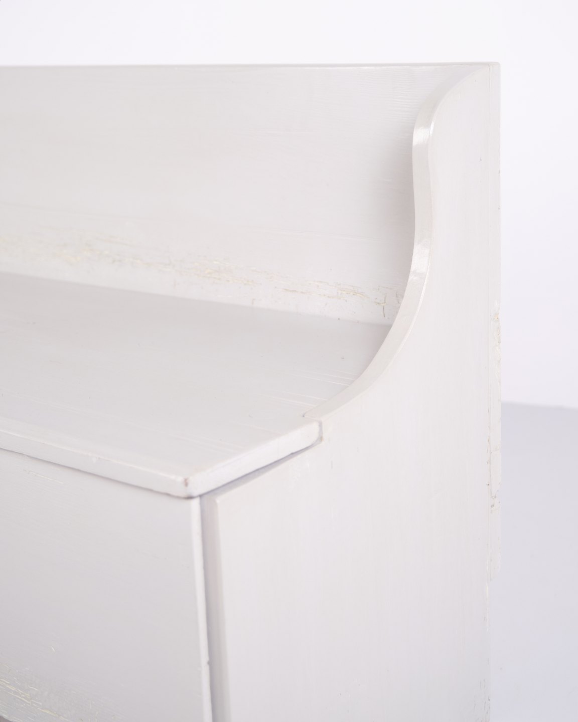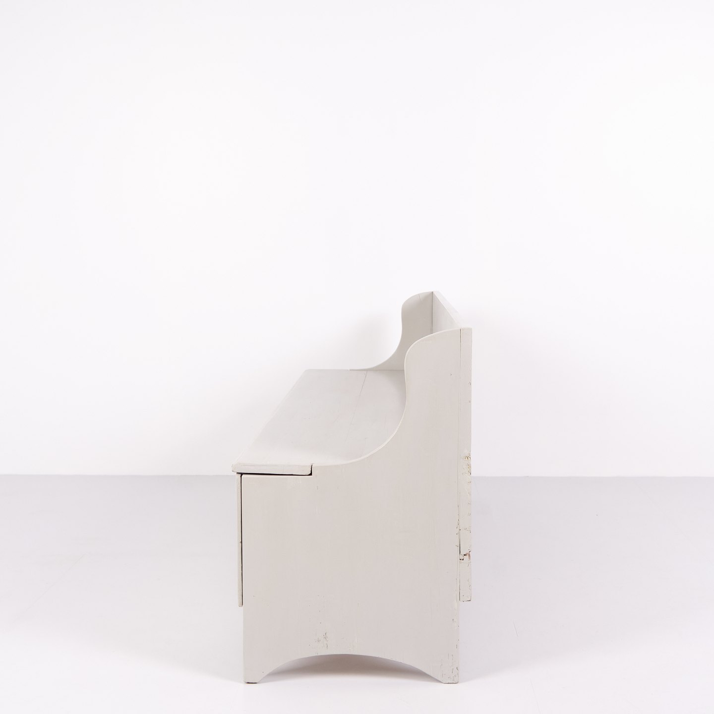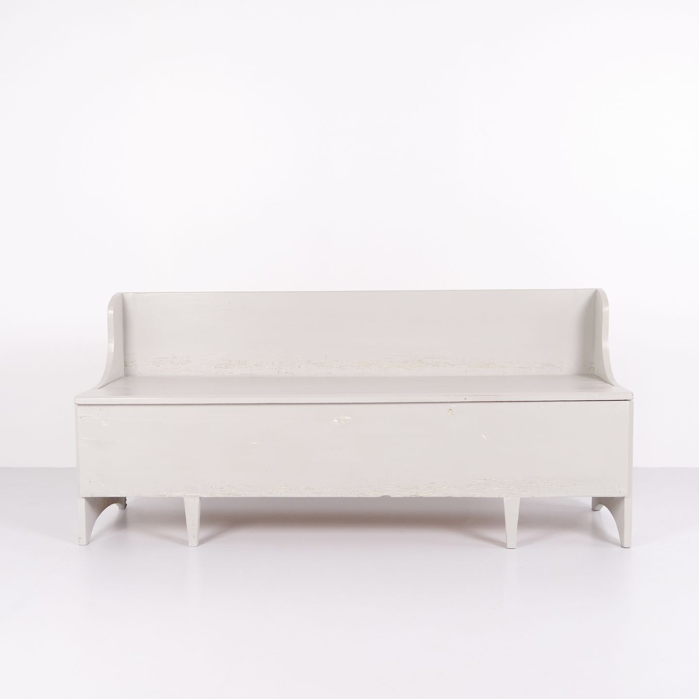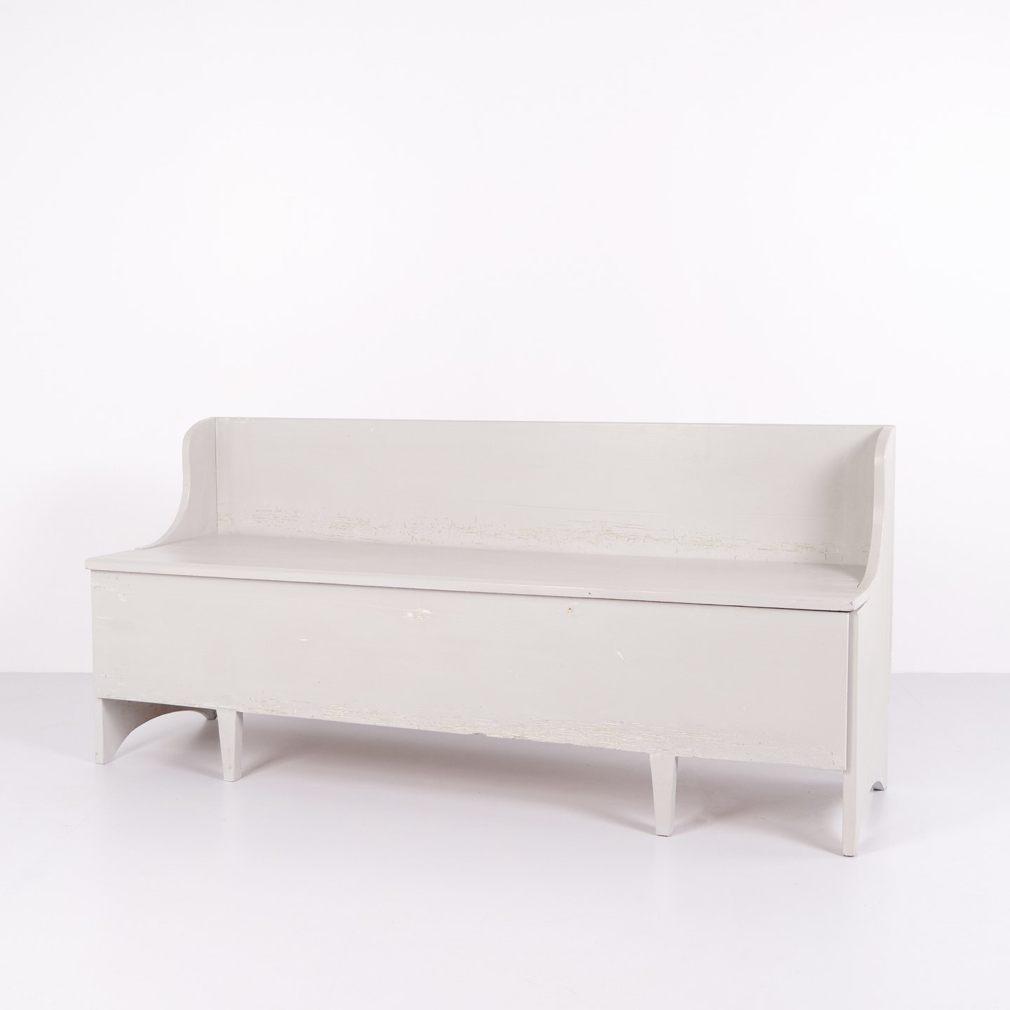 Antik slagbænk 1890’erne i gråmalet fyrretræ med opbevaring. Antik opbevaringsbænk 1800-tallet.