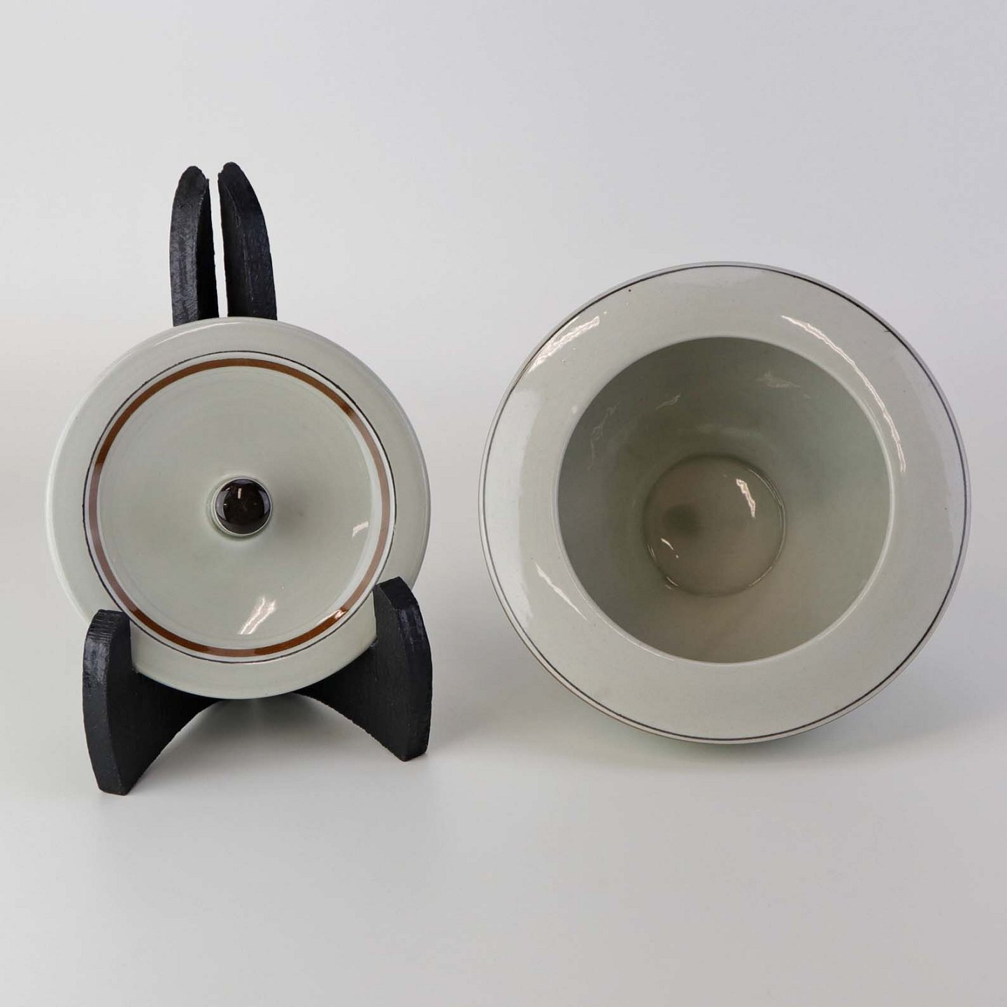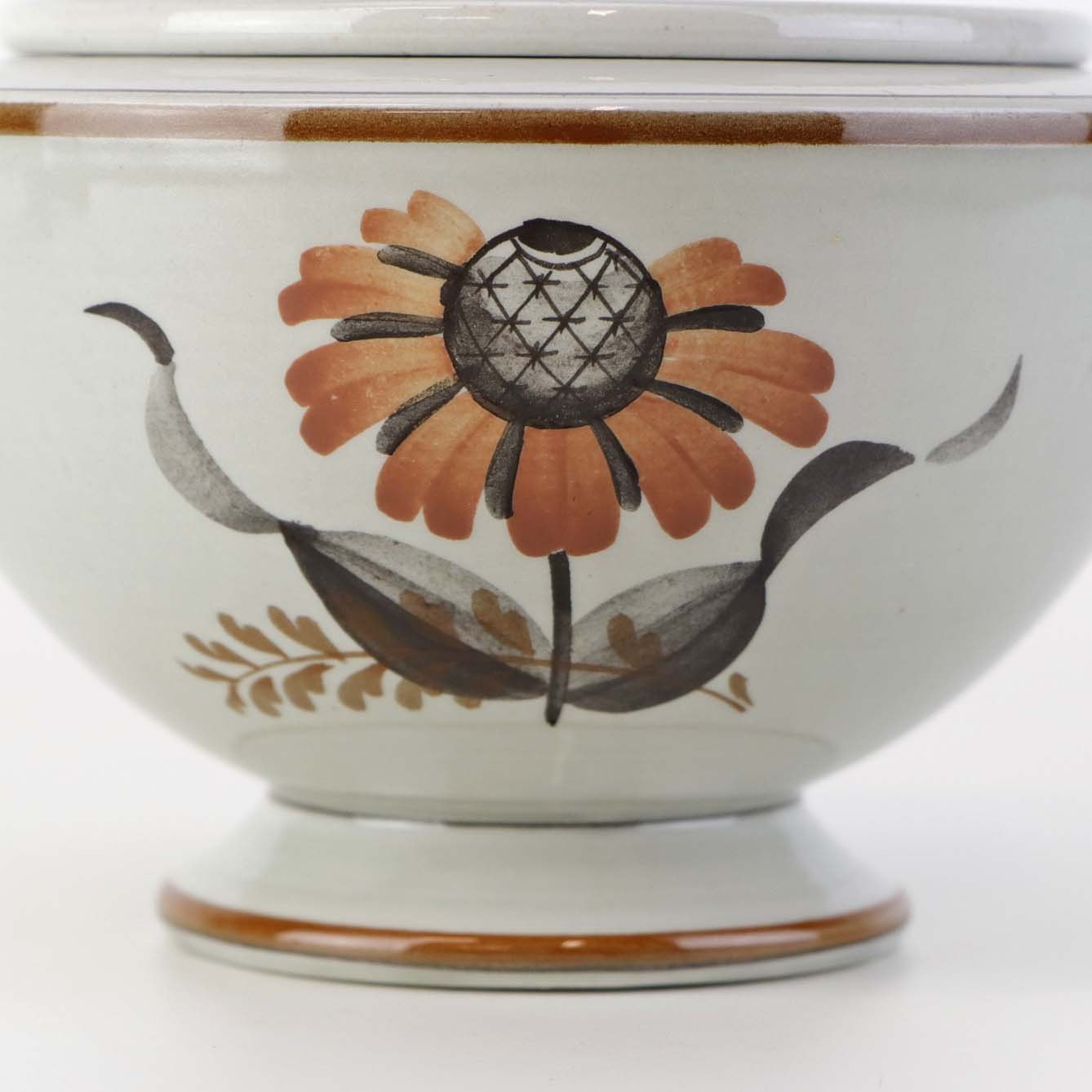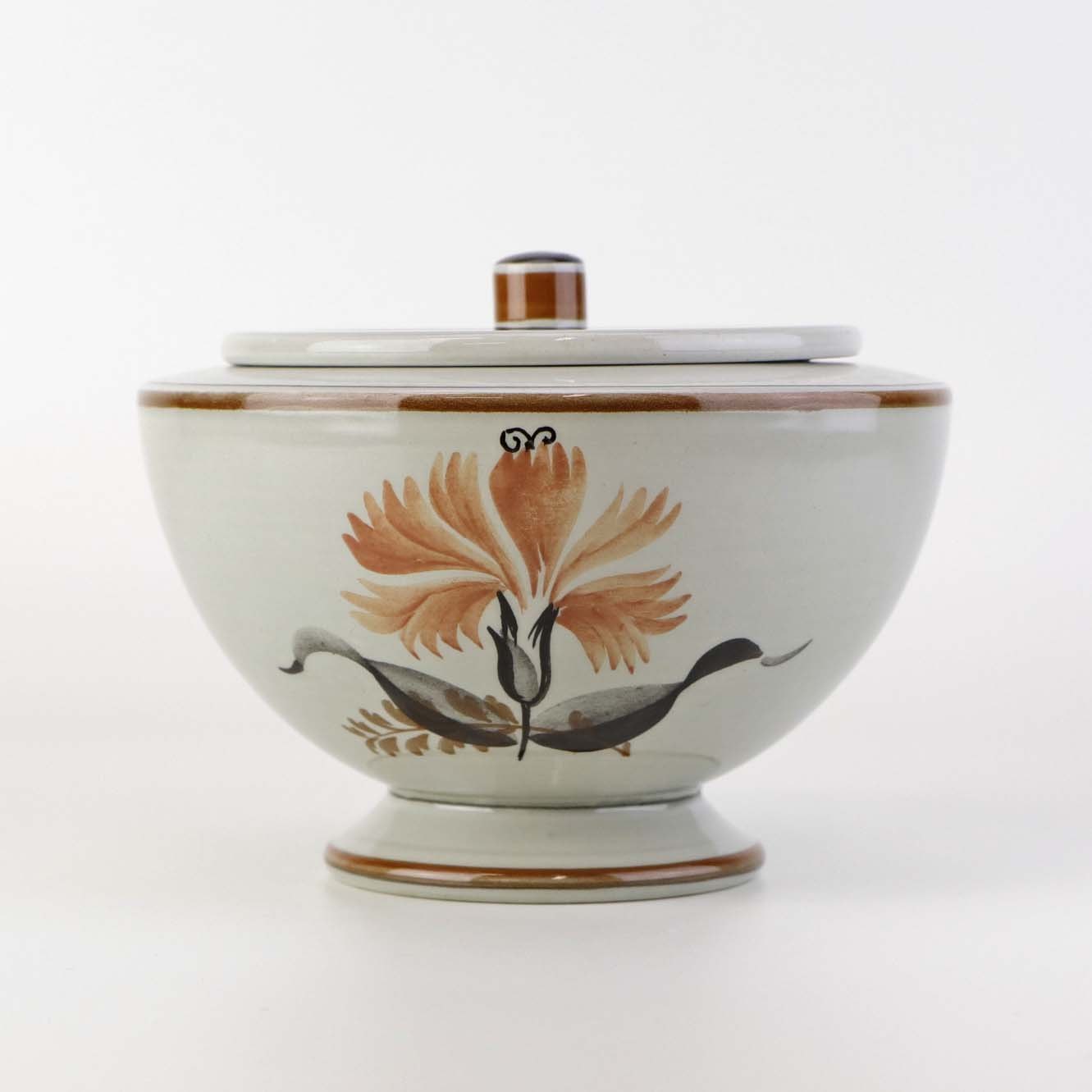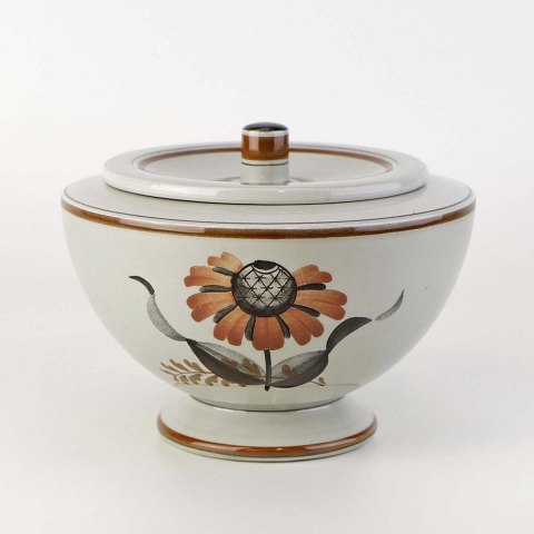 Lågskål til sukker i fajance fra stellet Kirsten, som blev fremstillet i perioden 1934-1957. Nr. 263