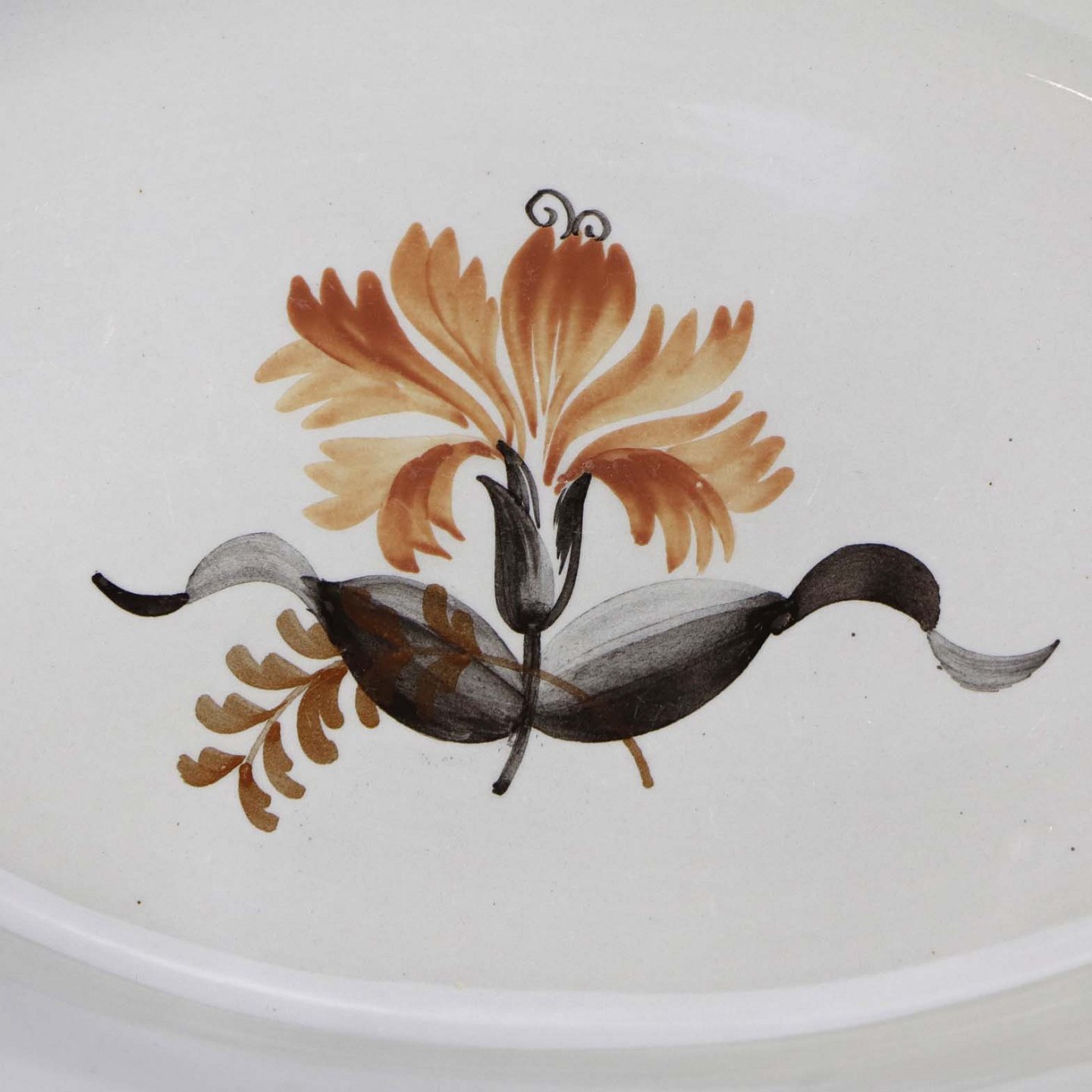 Fajancestellet er i stelformen Viktoria II med dekoration af orangebrune blomster på gråtonet baggrund med brun kant.
