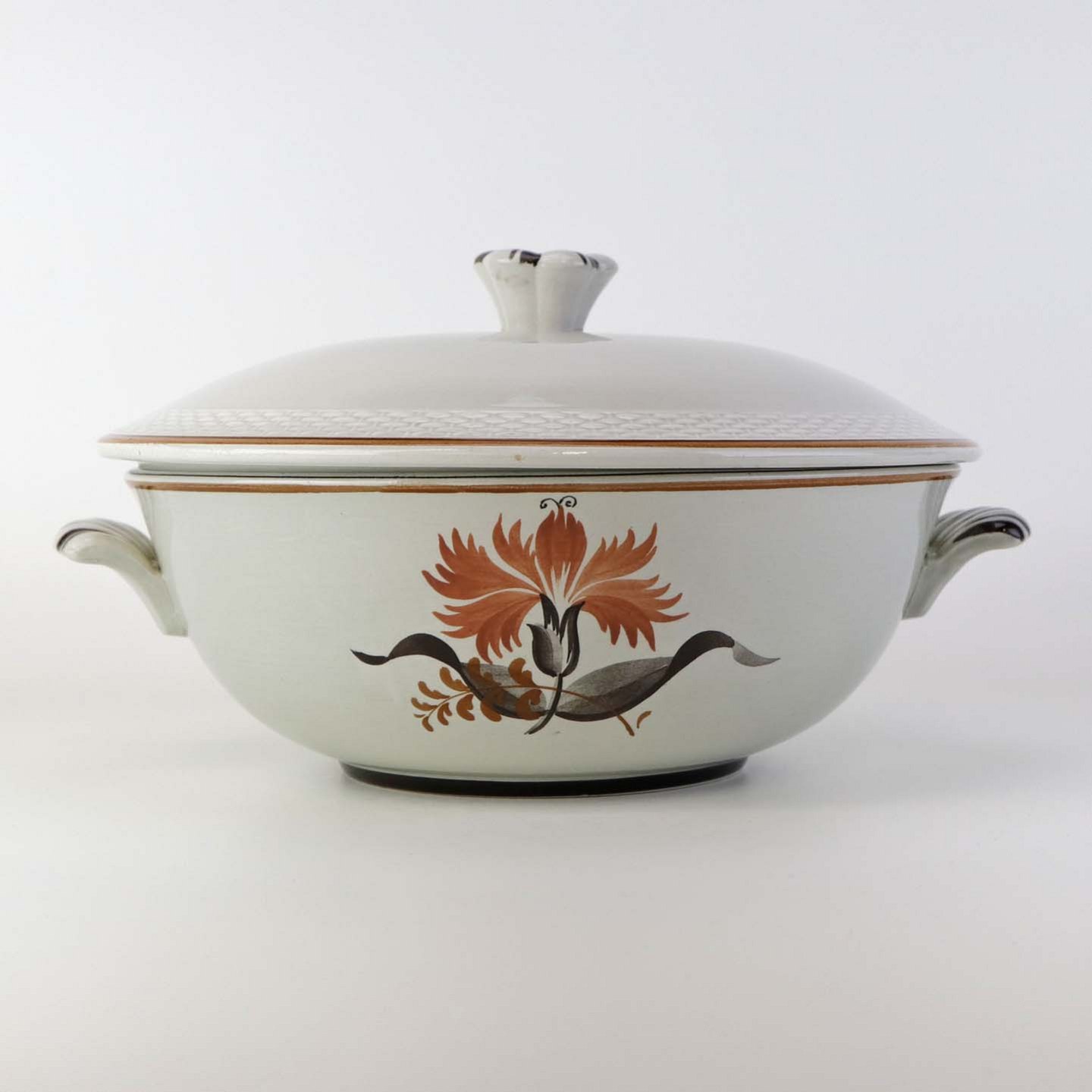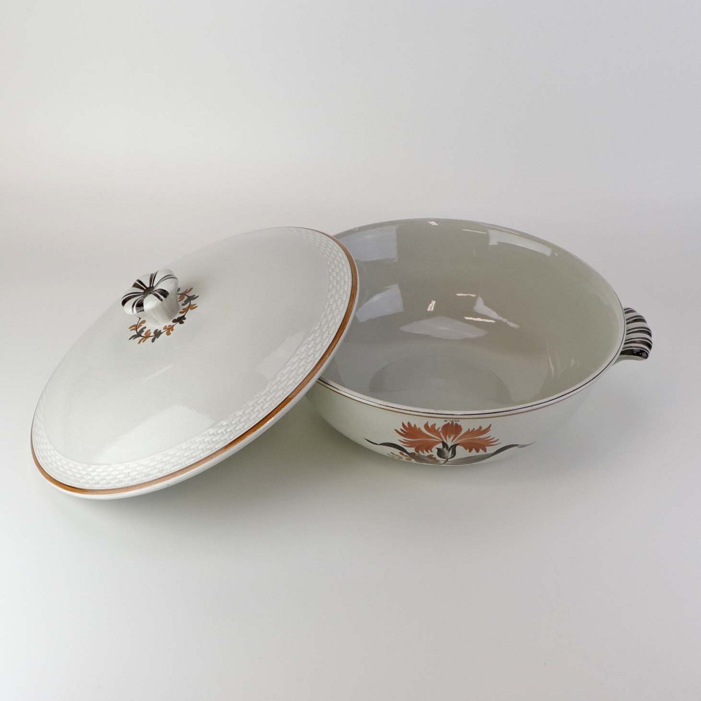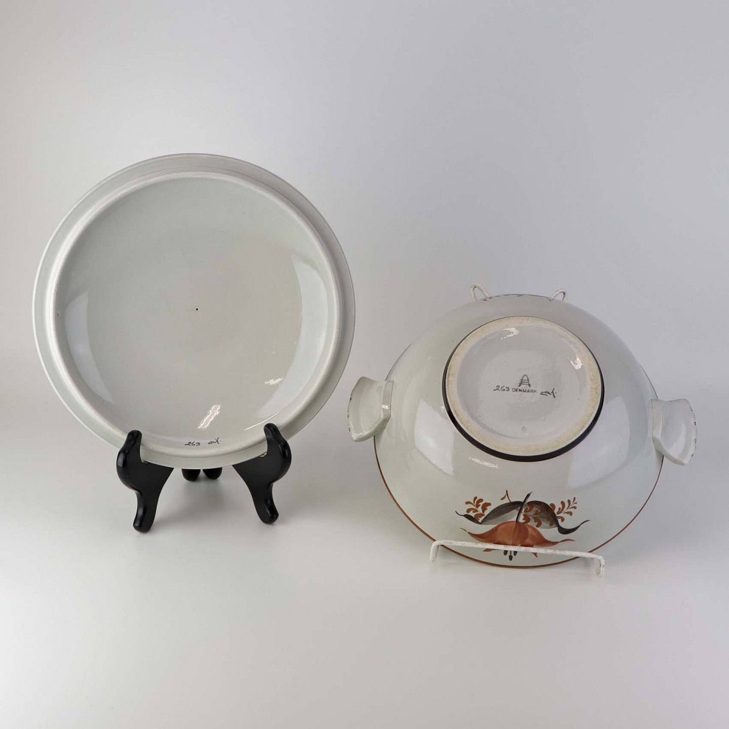 Lågfad i fajance med hanke fra stellet Kirsten, som blev fremstillet i perioden 1934-1957. Nr. 263