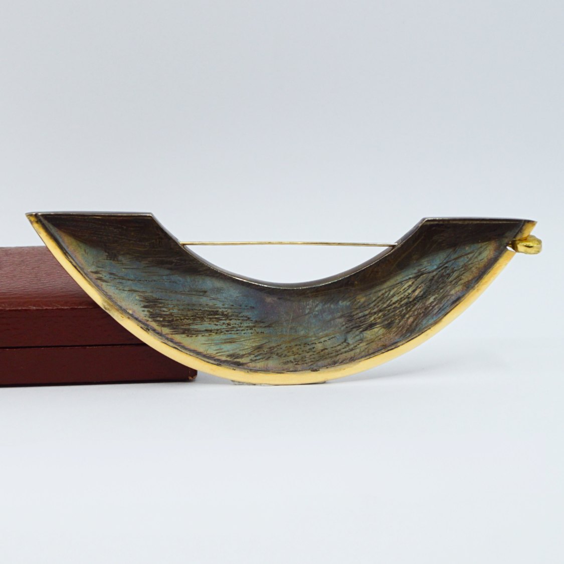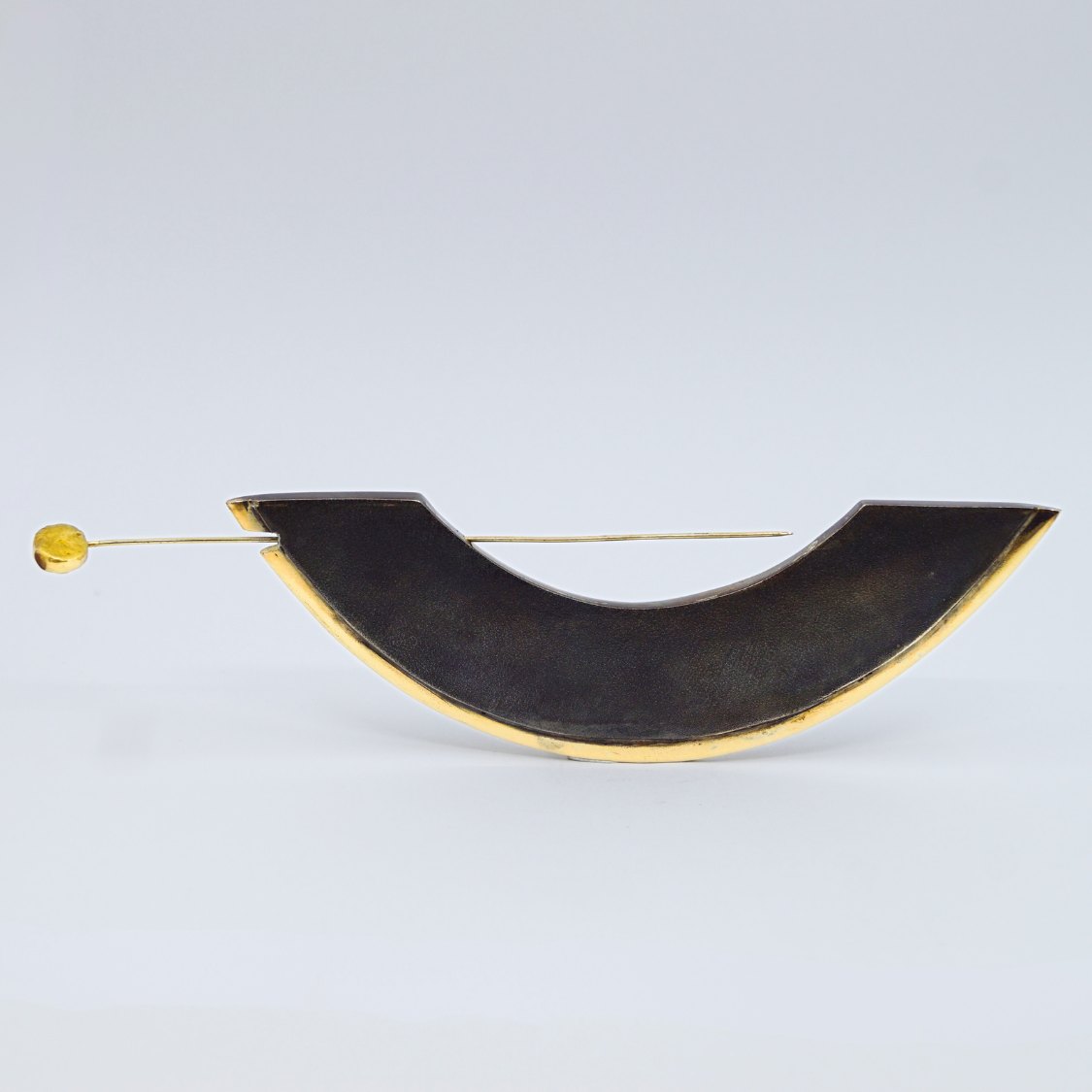 Anette Kræn; Stor kraftig sølv broche med oxideret overflade og pyntet med 14 kt. guld. Kan vendes på to forskellige måder, med hver sit udtryk.