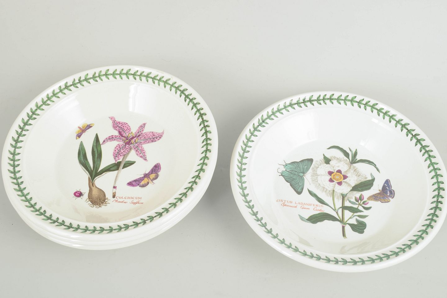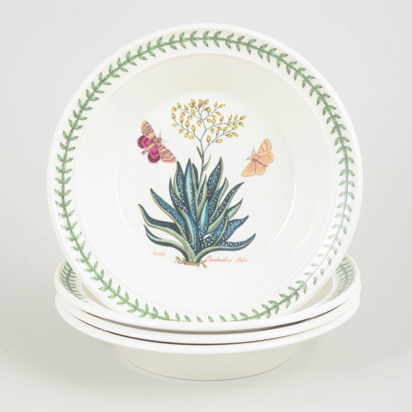 Sæt med 4 dybe tallerkener i fajance fra Portmeirion, dekoreret i “The Botanic Garden” serien med botaniske motiver og karakteristisk grøn bladbort.