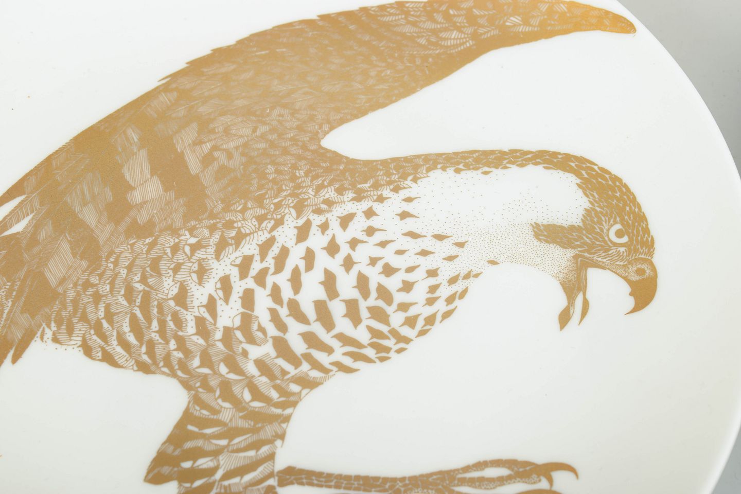 Sæt bestående af to samlertallerkener i porcelæn med motiv af havørn udført i gulddekoration. Tallerkenerne indgår i serien “Arter i fara”, model Havsörn, produceret i begrænset oplag i 1980’erne. Bagsiden er trykt med titel, serienummer og en kort naturhistorisk tekst om arten.