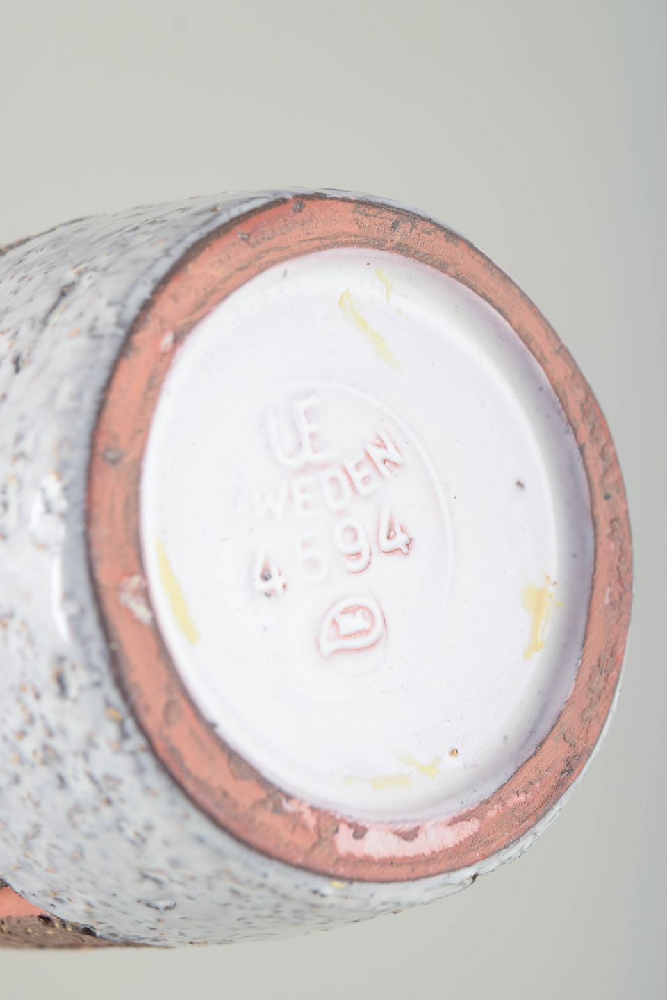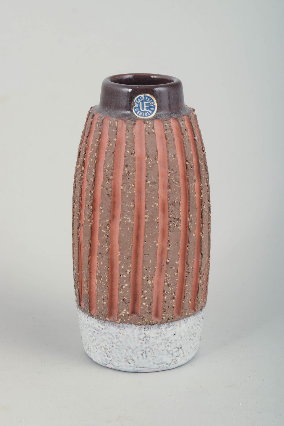 Lille cylindrisk vase i glaseret keramik med let indsnævret hals. Korpus er dekoreret med lodrette, reliefopbyggede striber i terrakottafarvede toner mod en mørkere, let spraglet bundglasur, afsluttet med en lys, groft struktureret fod. Dekorationen giver et markant taktilt og modernistisk udtryk. Modelnummer 4594.