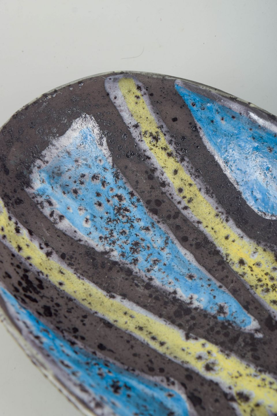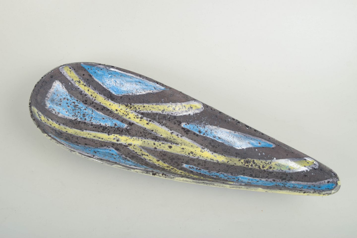 Stor, organisk oval skål i glaseret keramik med abstrakt, hånddekoreret mønster i blå, gule og mørke toner med karakteristisk plettet effekt i glasuren.