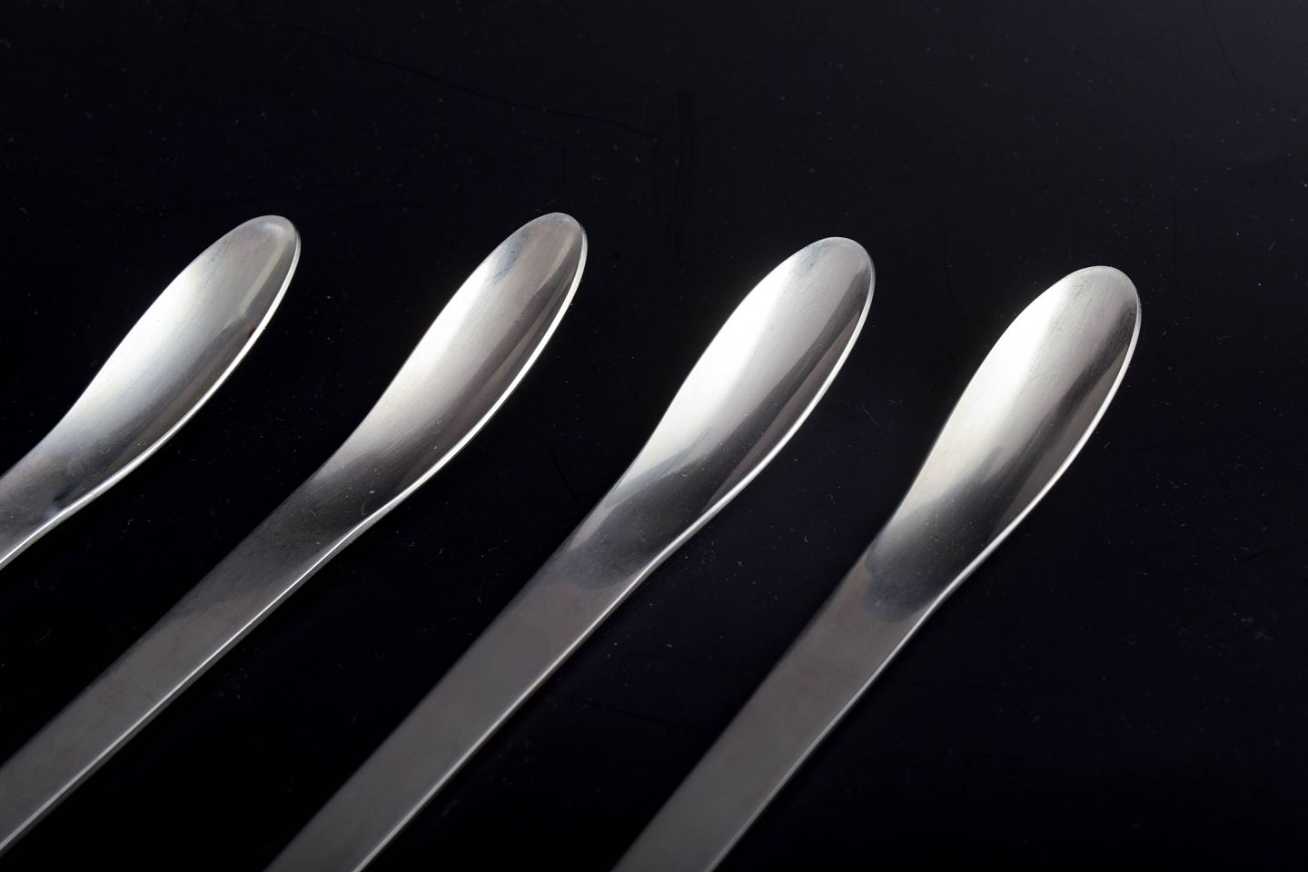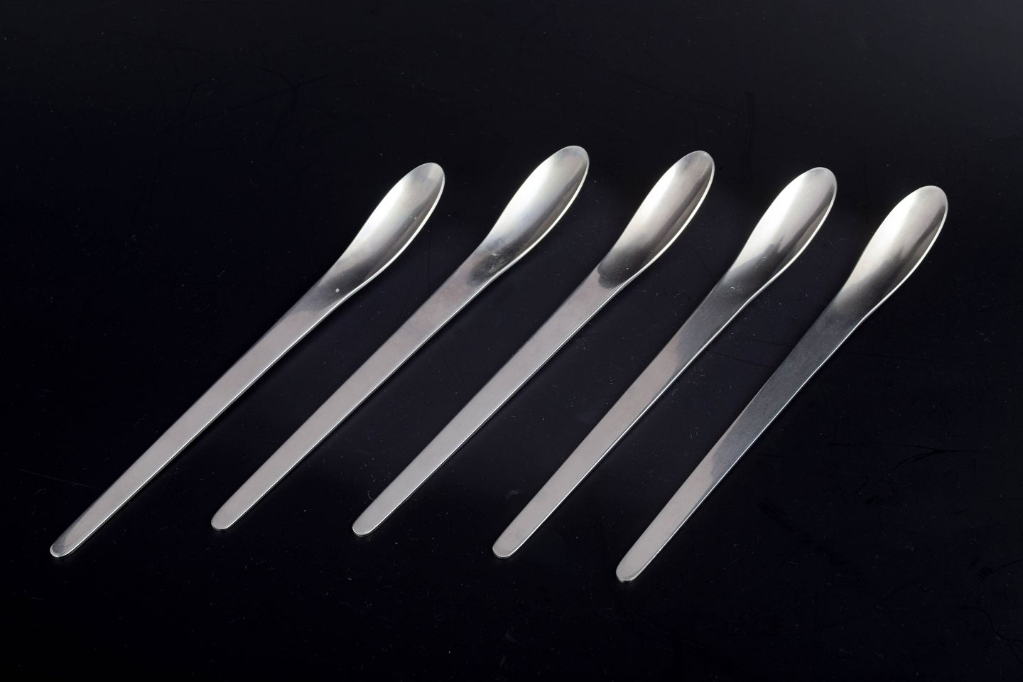 Sæt bestående af fem lange caffe latte skeer i rustfrit stål med slankt, minimalistisk formsprog. Udført til høje glas og krus, velegnet til kaffe- og dessertservering.
