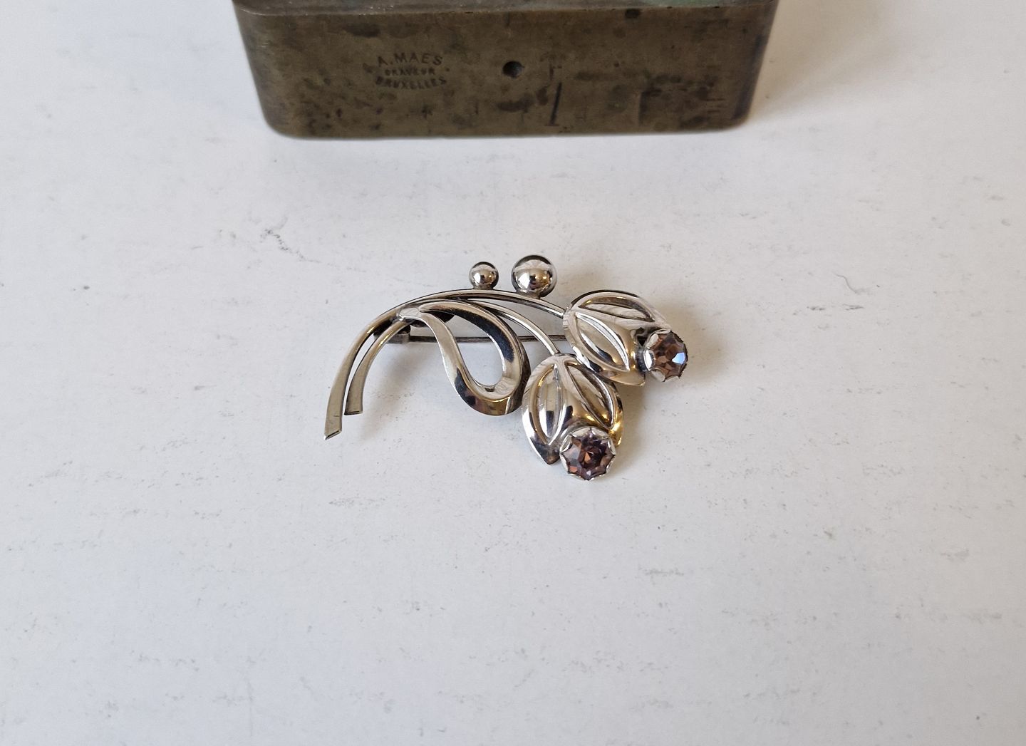 Vintage sølv broche i form af blade og blomster med lilla sten af Hermann Siersbøl