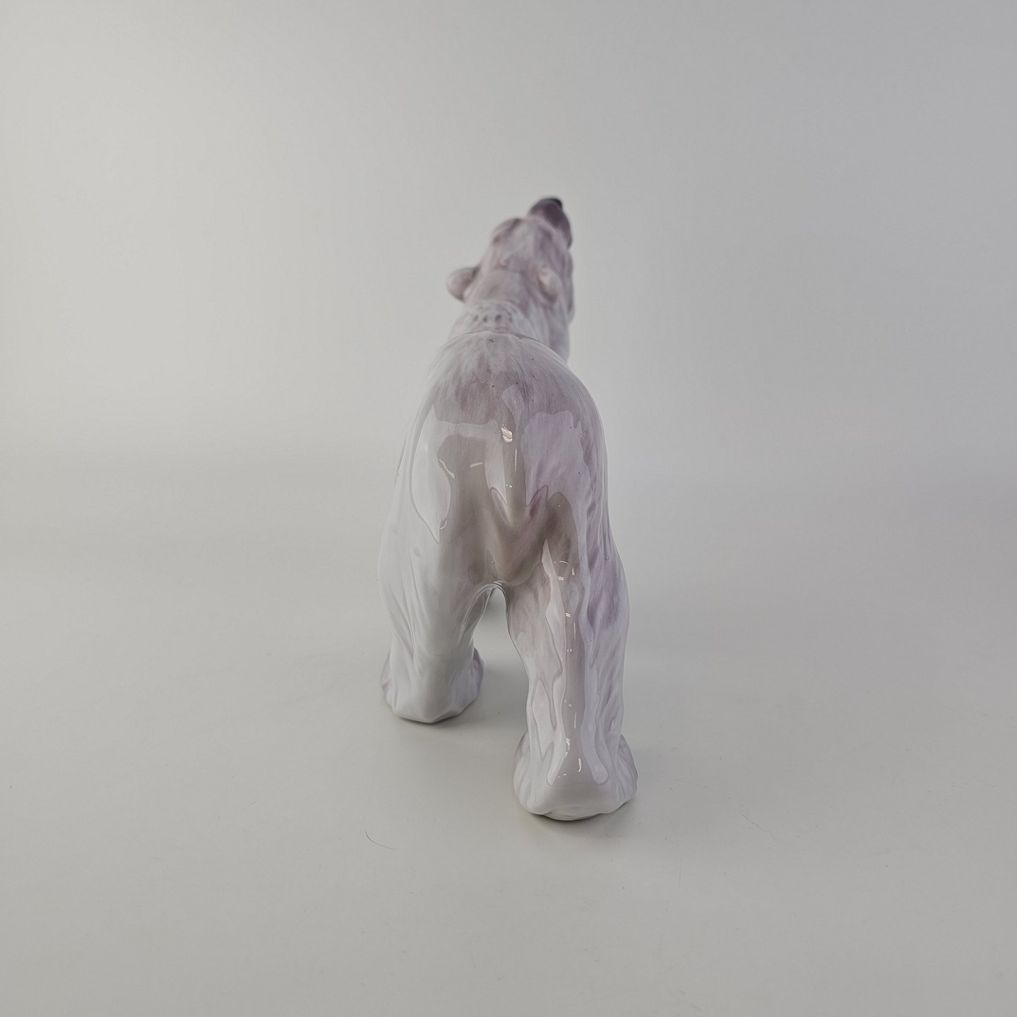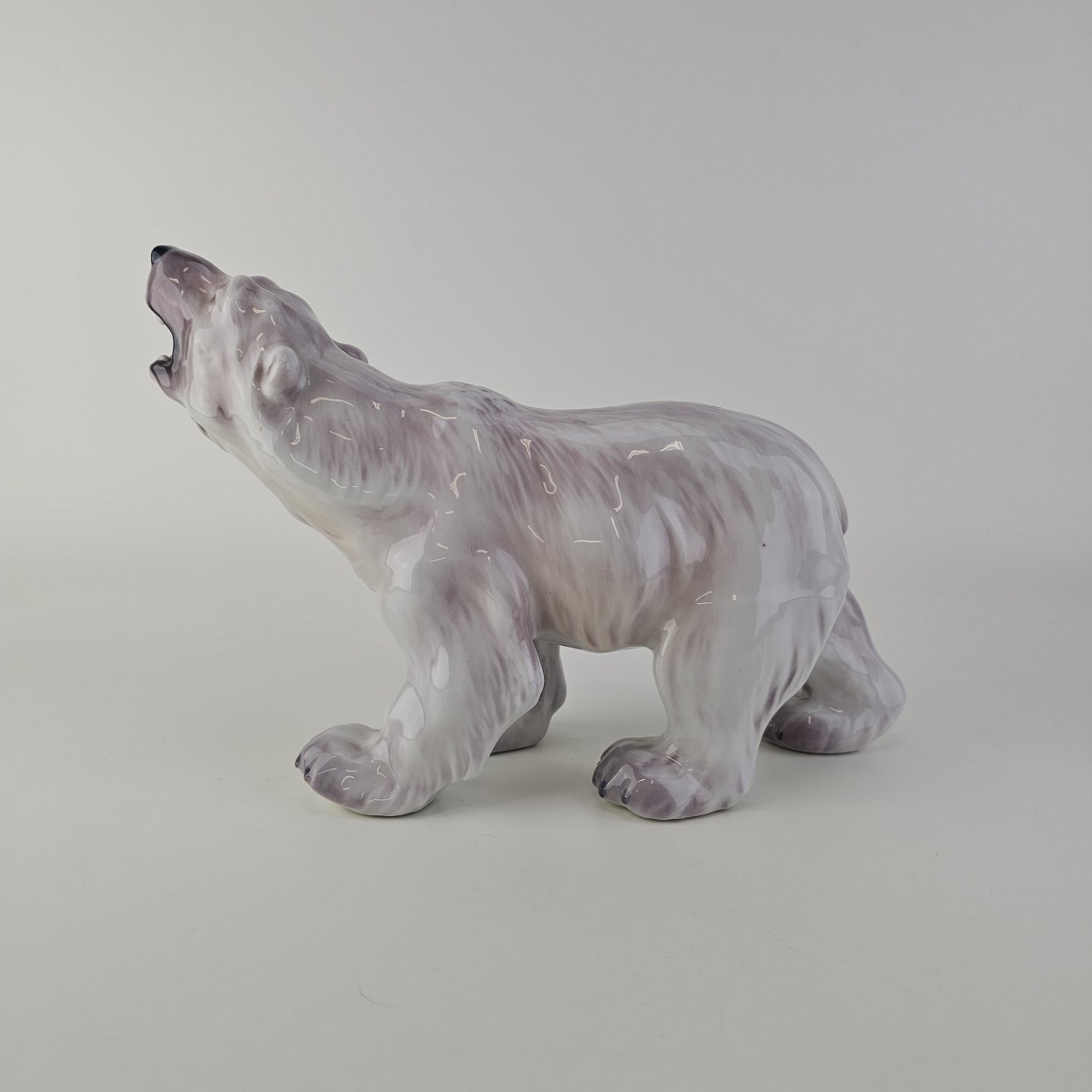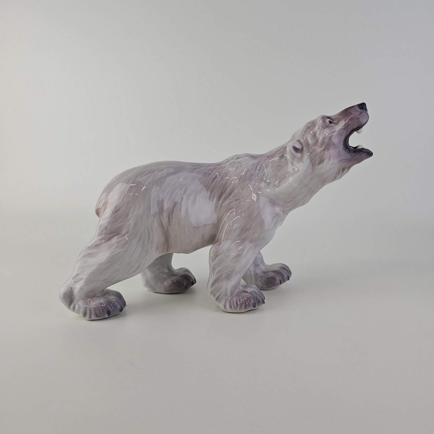 Figur i hvidt porcelæn med motiv af en brølende isbjørn