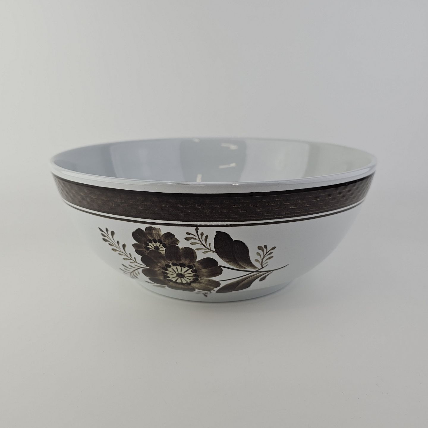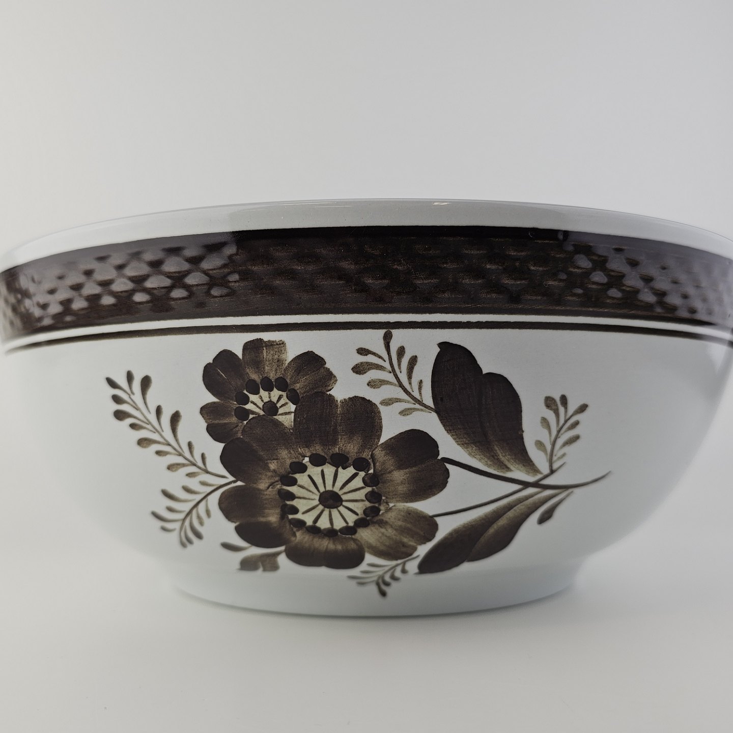 Fajancestellet med flettet kant og dekoration af brune blomster på lys baggrund med brun kant