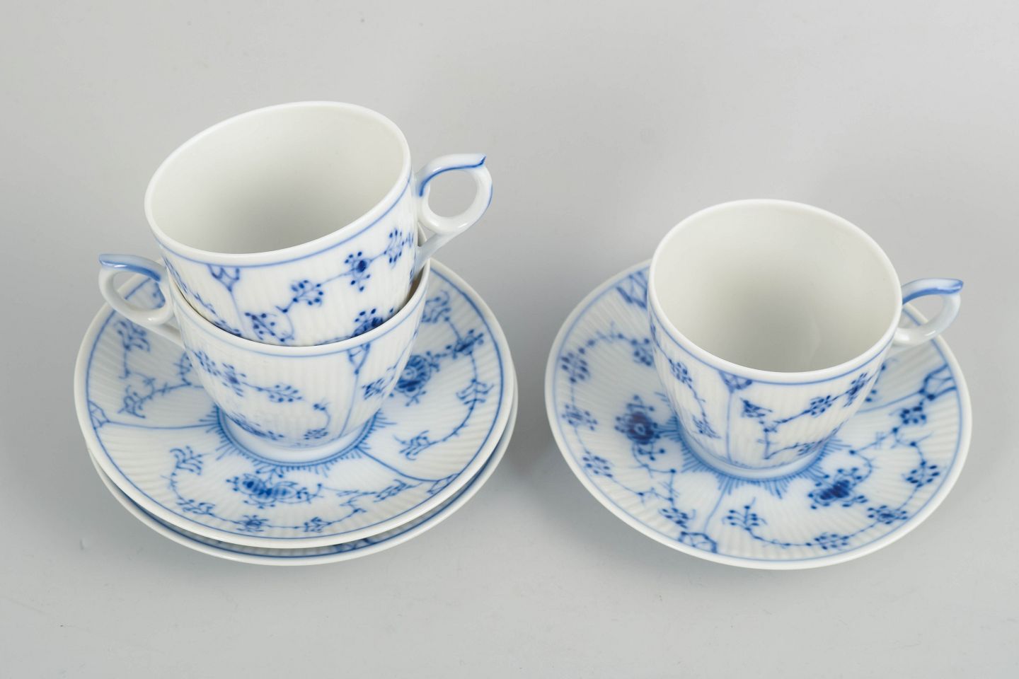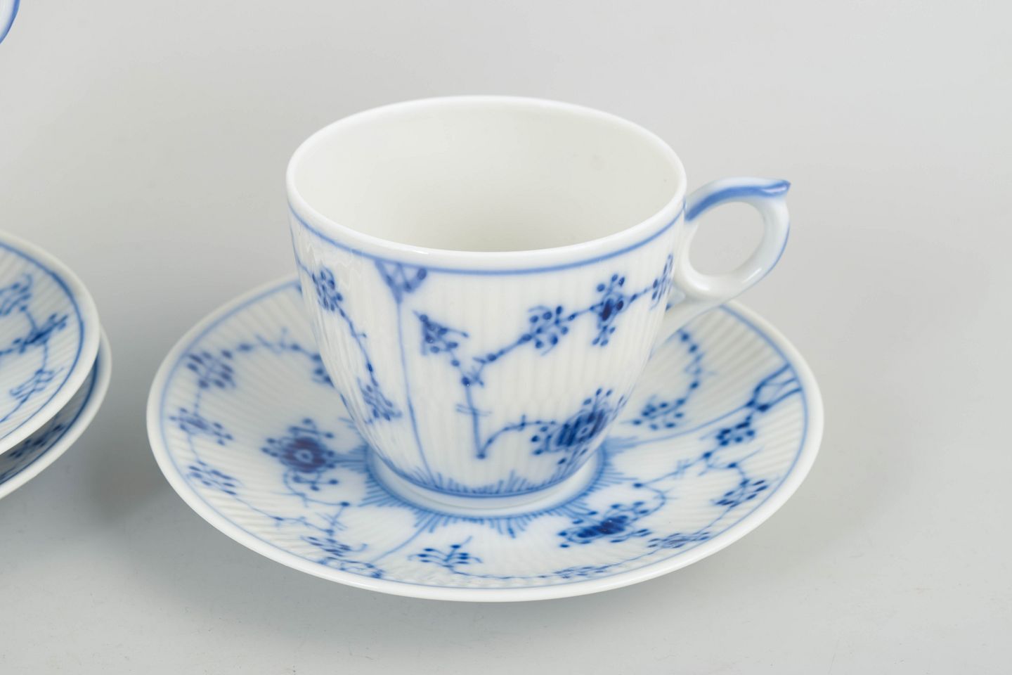 Royal Copenhagen, Musselmalet Riflet, kaffestel til 3 personer.