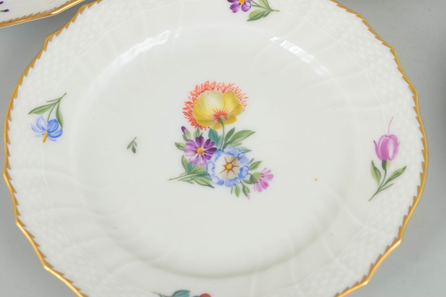 Let Saksisk Blomst er en af Royal Copenhagens klassiske blomsterserier, kendetegnet ved naturalistiske blomsterbuketter og fine farvenuancer. Serien blev produceret i første halvdel af 1900-tallet og anvendt til både serverings- og kageporcelæn, hvor den lette formgivning og den forgyldte kant understregede den elegante borddækningstradition.