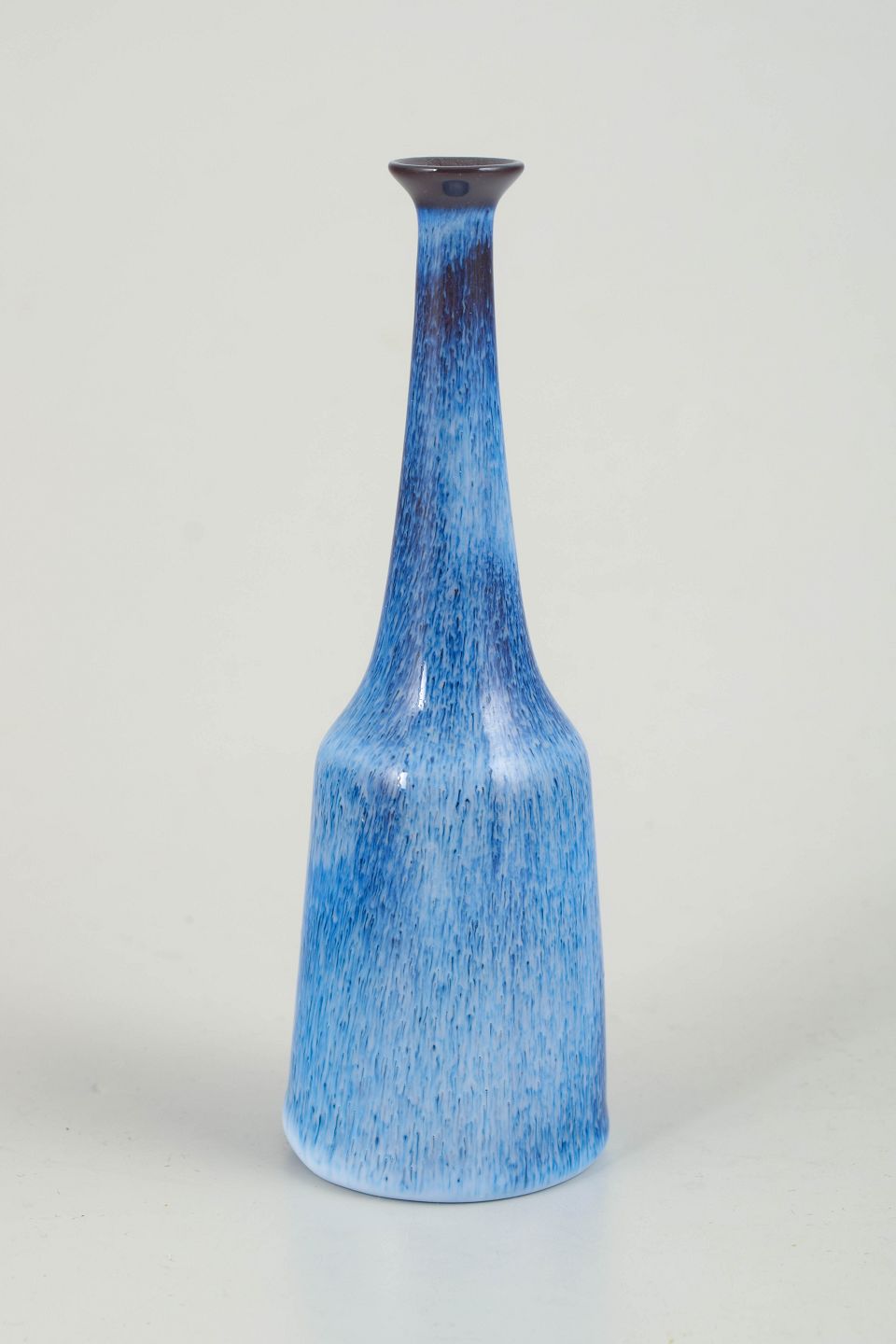 Slank vase i glaseret stentøj med lang, smal hals og let konisk krop. Overfladen er dækket af en levende blå glasur med fine lodrette spil og mørkere accent ved mundingen. Udført i første sortering og et fint eksempel på Gunnar Nylunds arbejde i mindre skala.