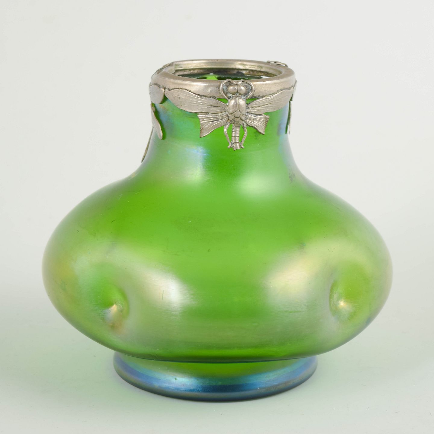Art Nouveau-vase i iriserende kunstglas med klar grøn grundtone og blødt afrundede, organiske former. Lav og bred bug med let indtrukket hals, afsluttet med dekorativ tinmontering udført i et stiliseret, naturinspireret motiv. Overfladen viser et diskret farvespil med blålige nuancer mod foden, karakteristisk for perioden.