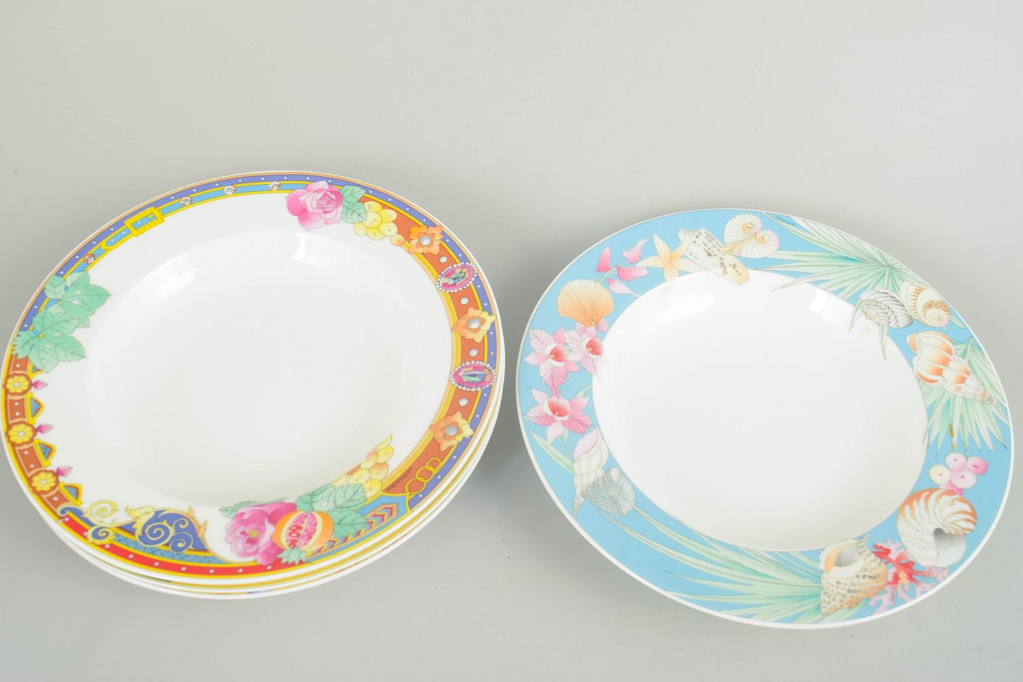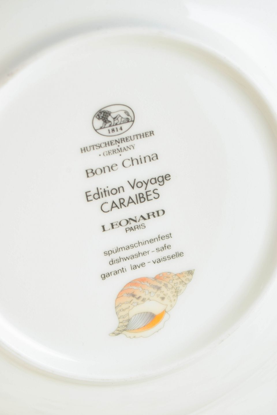 Elegant sæt i porcelæn med farverig, dekorativ dekoration; modellen Leonard Paris er angivet i beskrivelsen. Klassiske dybe former med bred fane og detaljeret dekoration langs kanten.