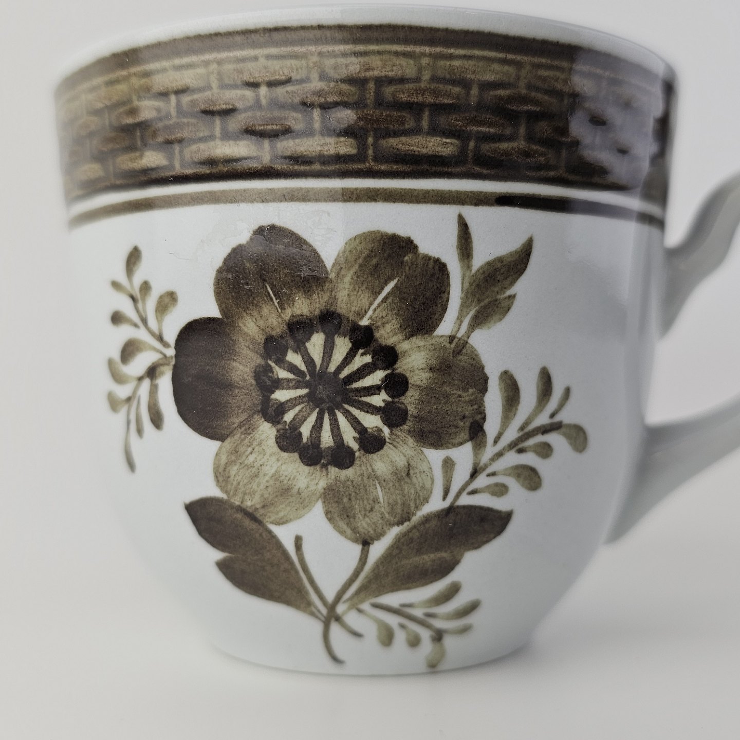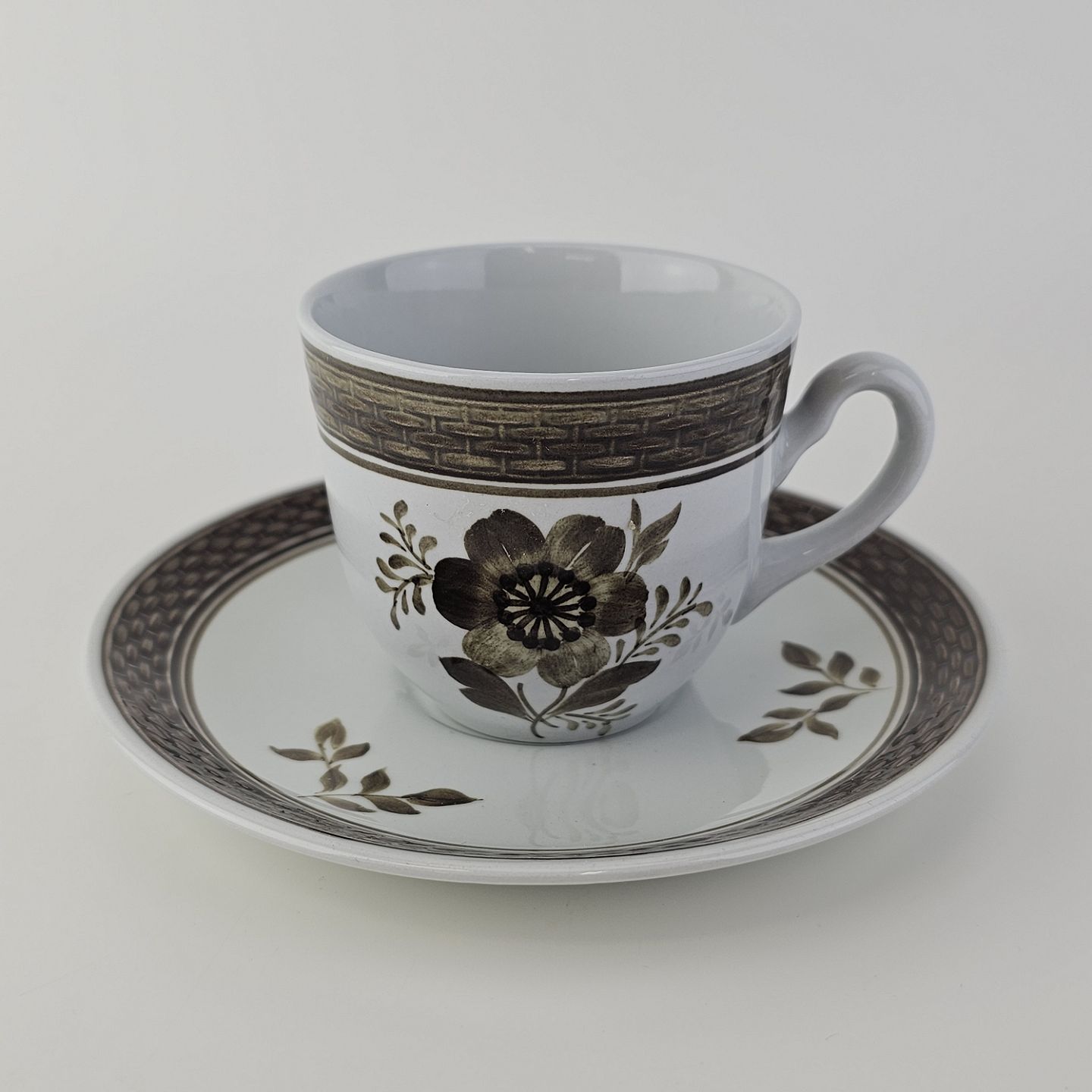 Kop med underkop i fajance fra stellet Brun Tranquebar fra år 1919