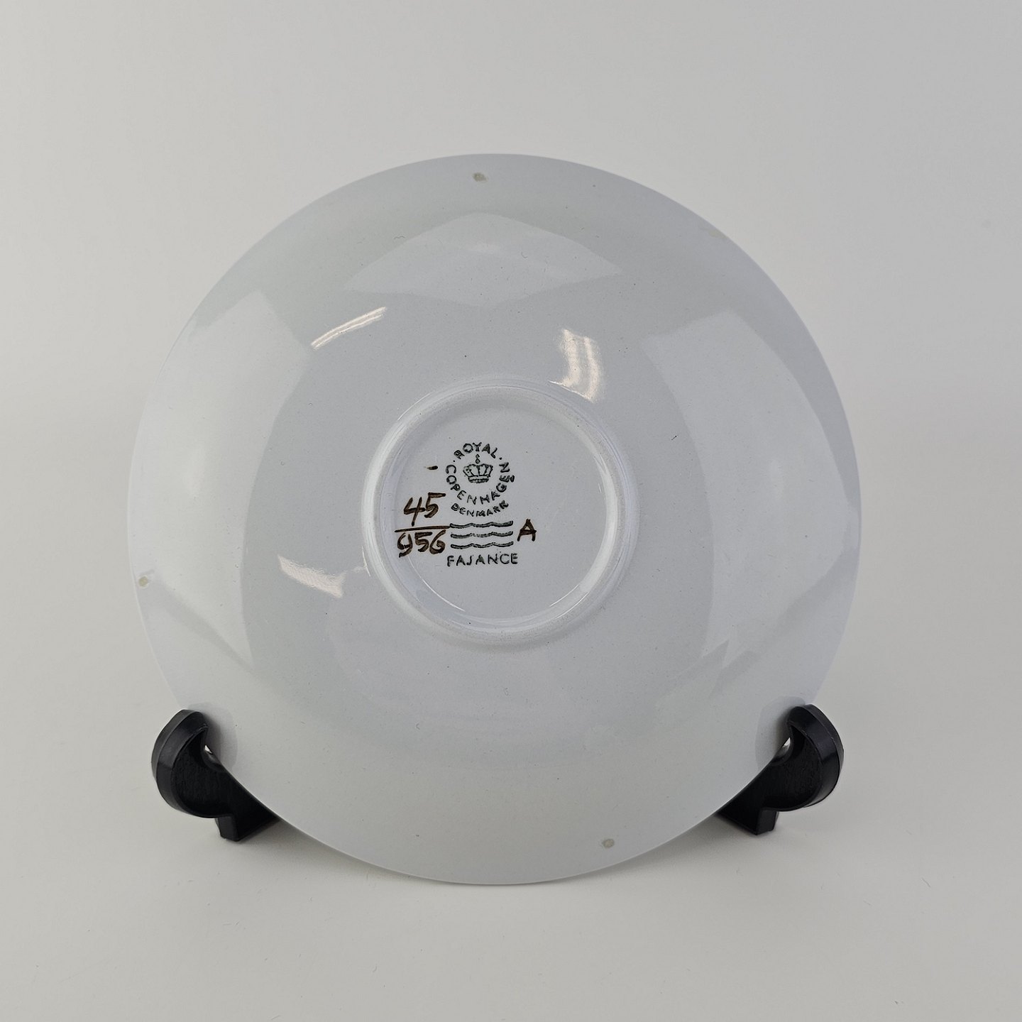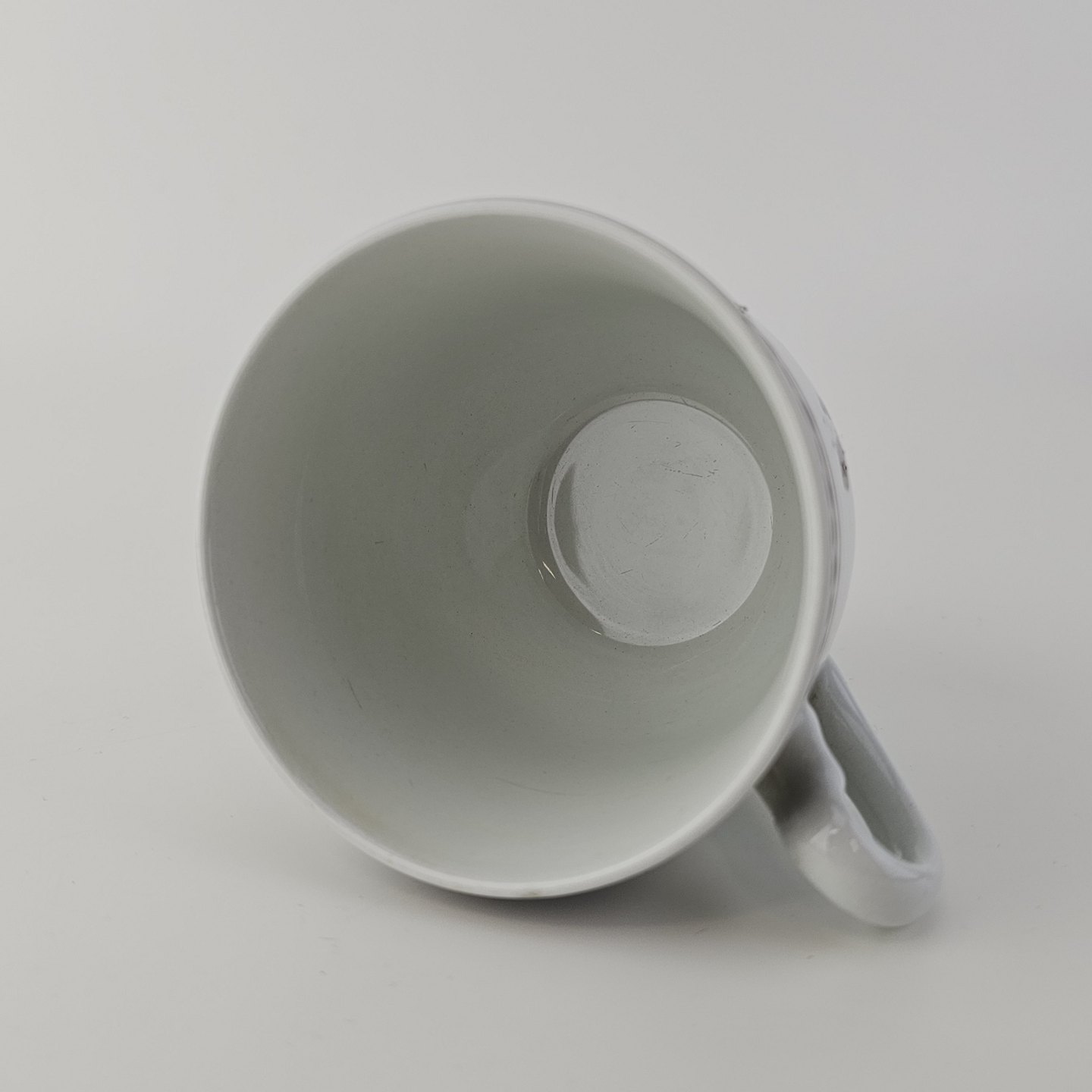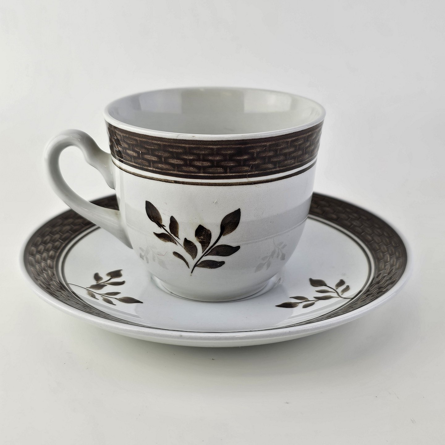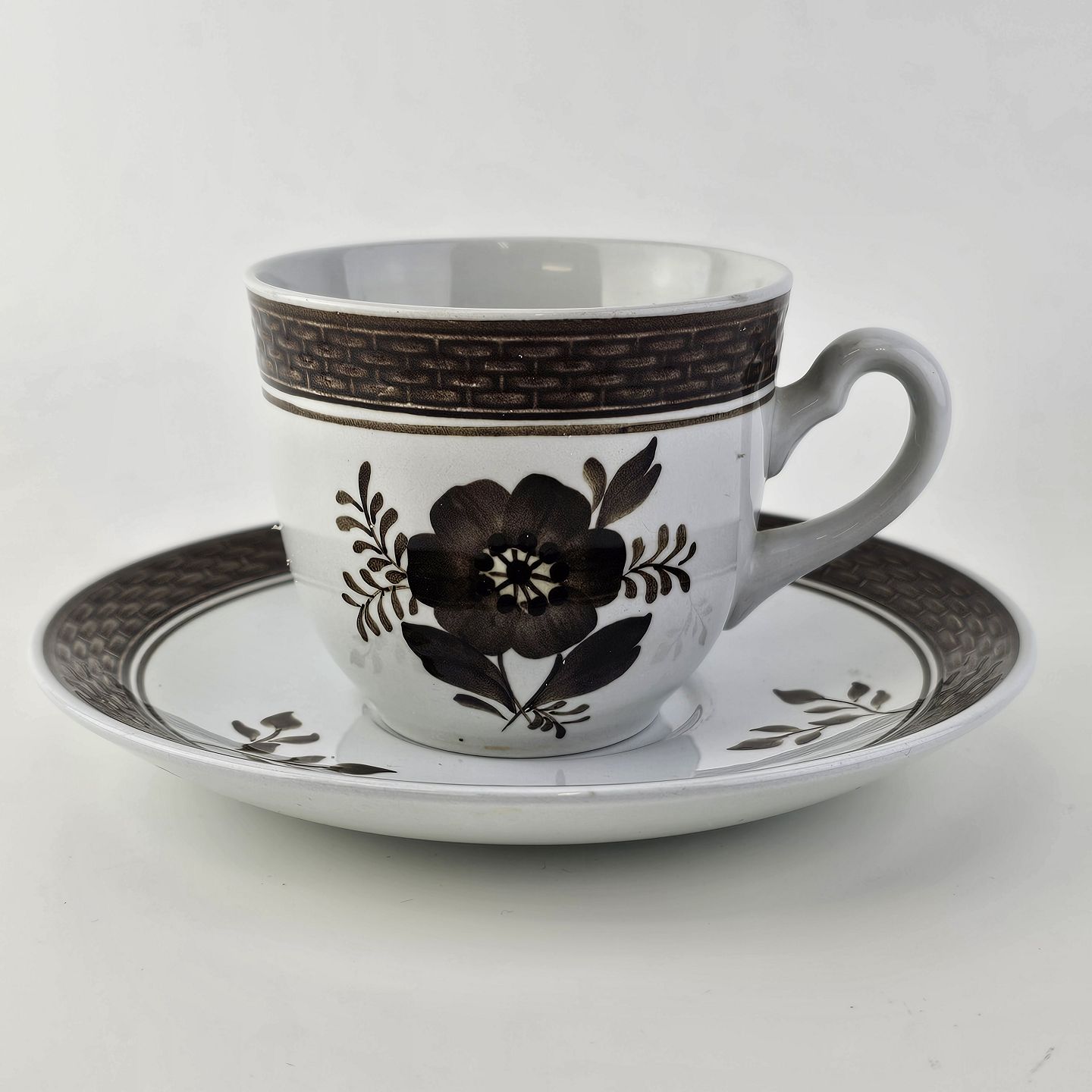 Kop med underkop i fajance fra stellet Brun Tranquebar fra år 1919