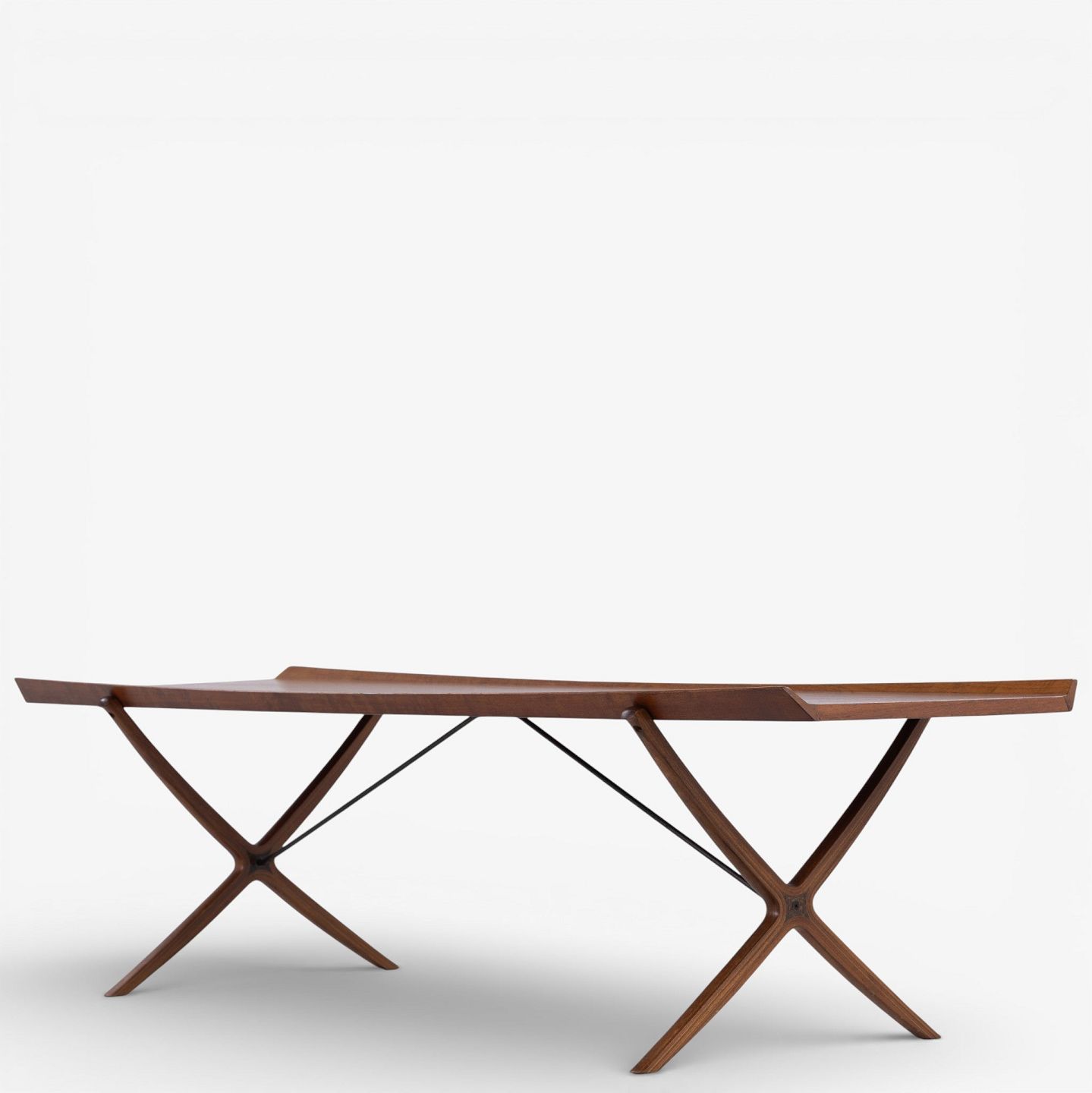 Sjældent 'X'-sofabord med top i patineret teak m. kehlet kant på krydsstel. Stemplet fra producent.
