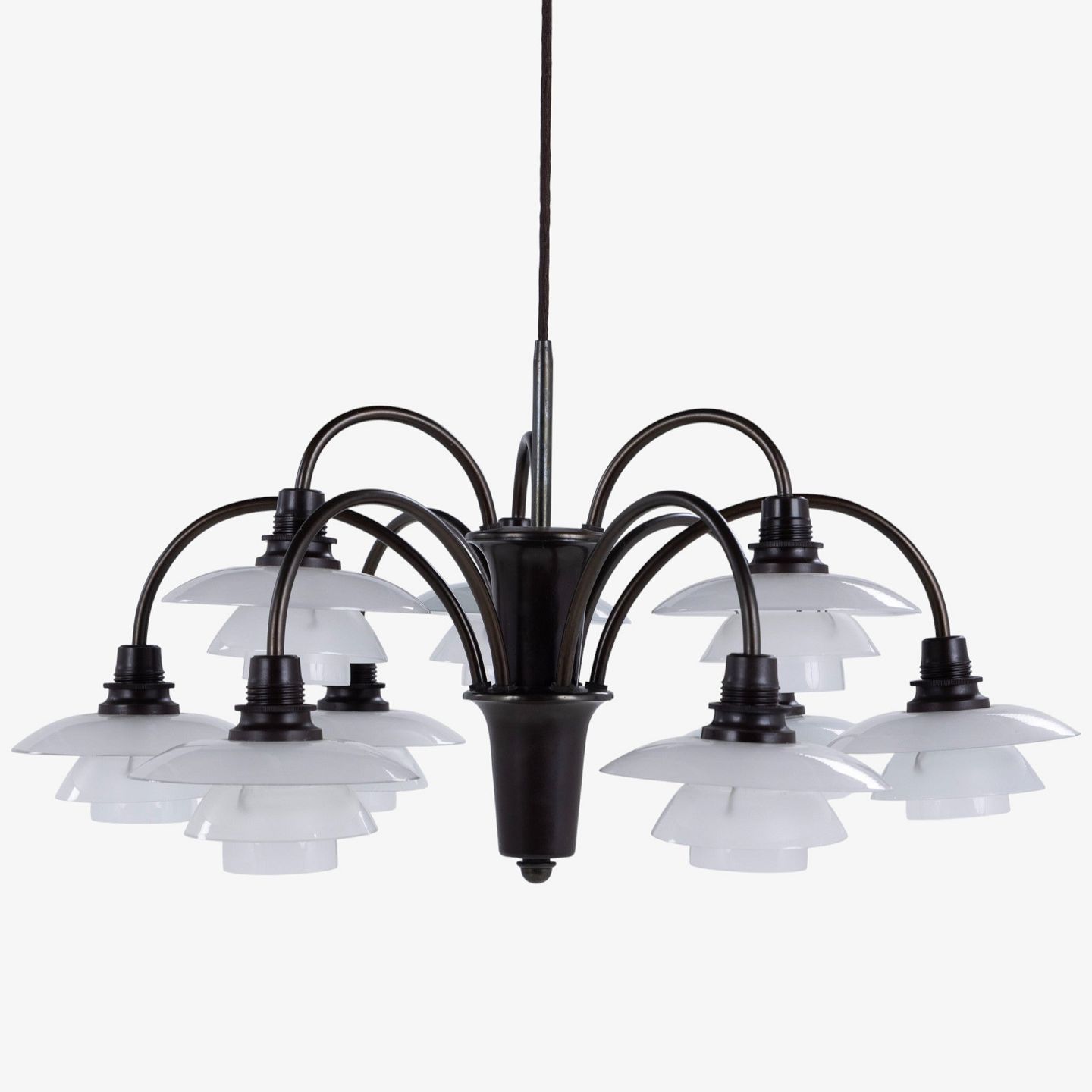 PH 1/1 - 'Bombardement'-lysekrone med 9 arme i bruneret messing og skærme i mat glas. Stemplet 'Patented'.