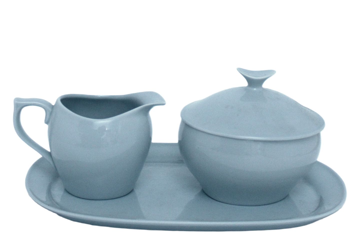 Bing & Grøndahl, Leda, Sart lysegrå/lyseblå stel. Sukker og flødesæt på bakke. Farven snyder meget, på billederne ser det lyseblåt ud og alt efter lyset ser det gråt ud.