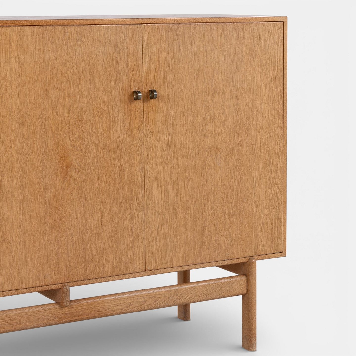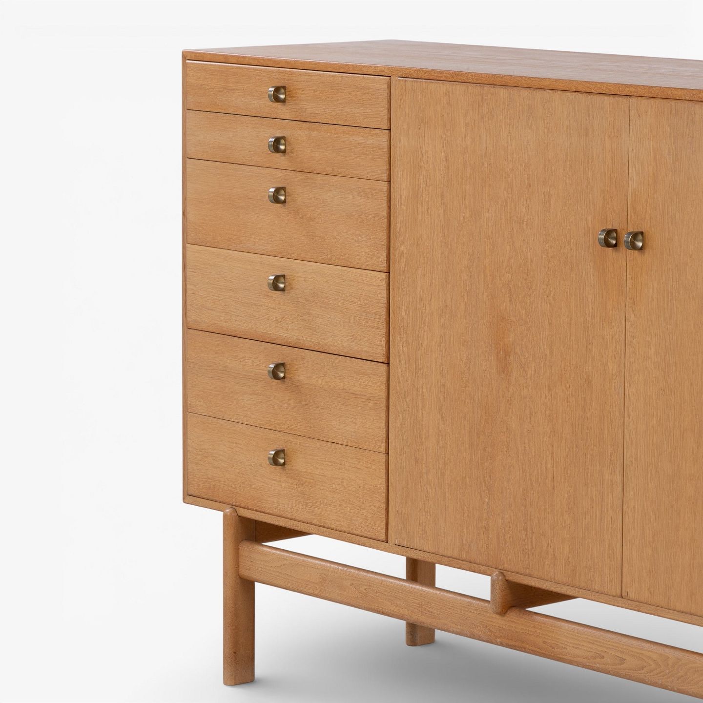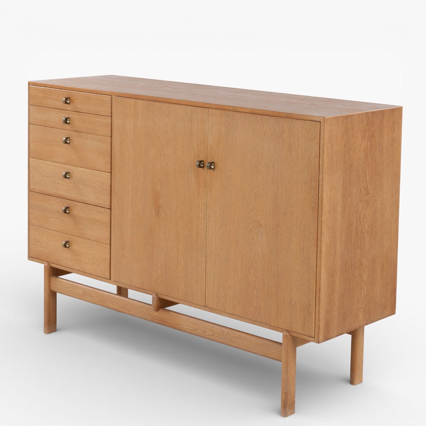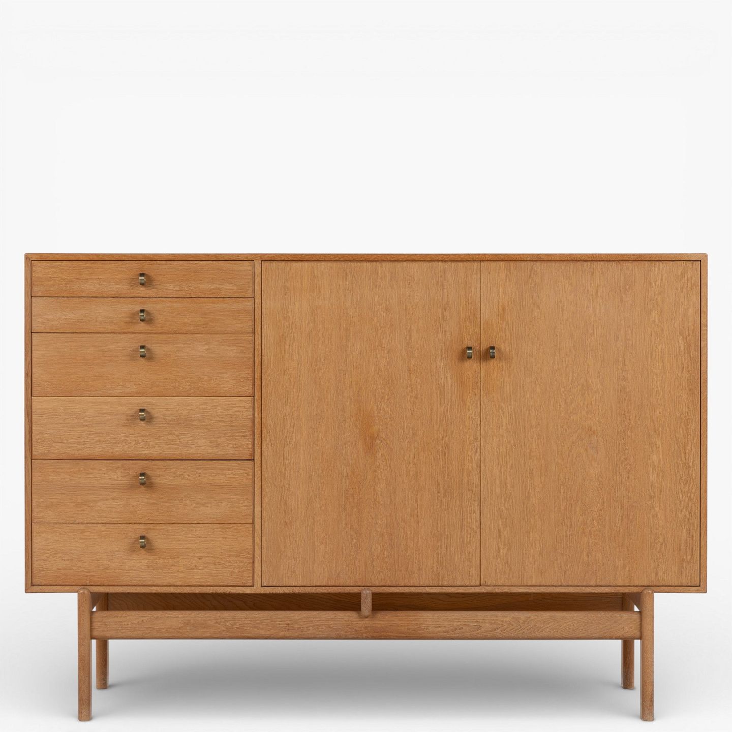 Skænk i patineret egetræ med to låger og otte skuffer m. messinggreb. Stemplet fra producent.