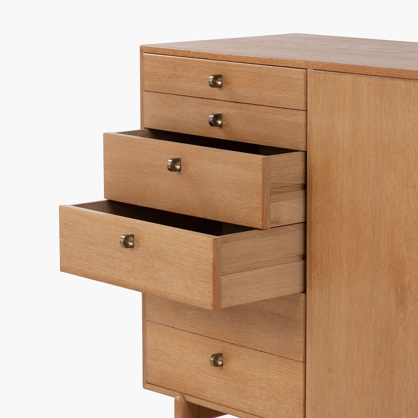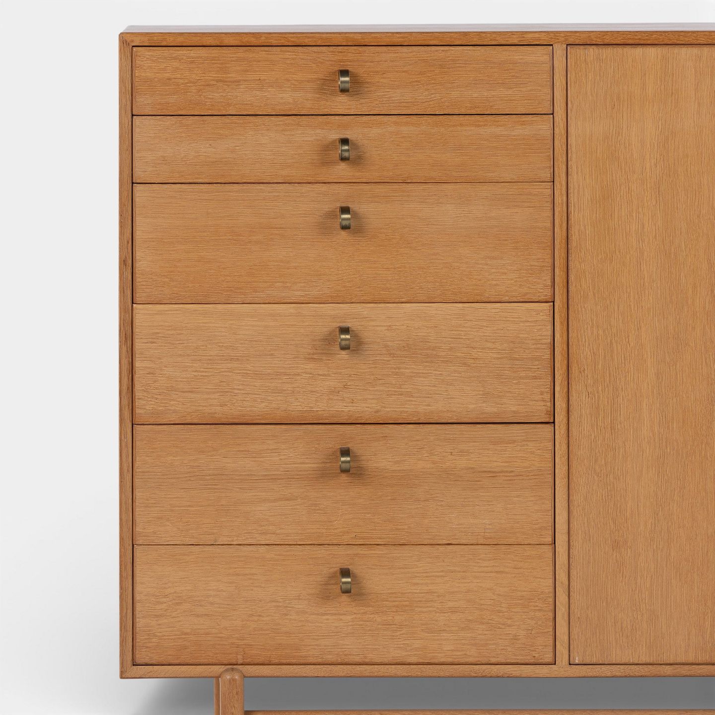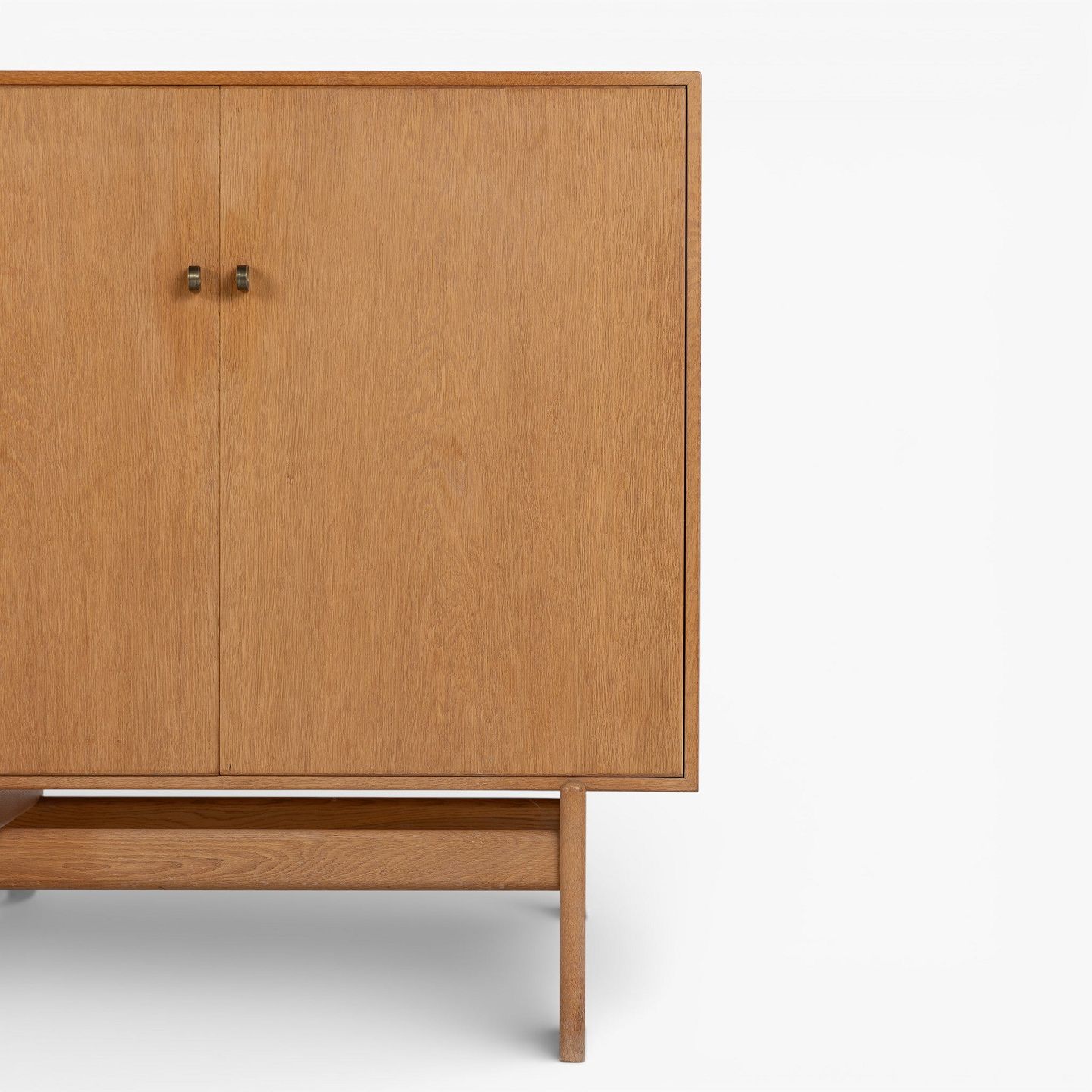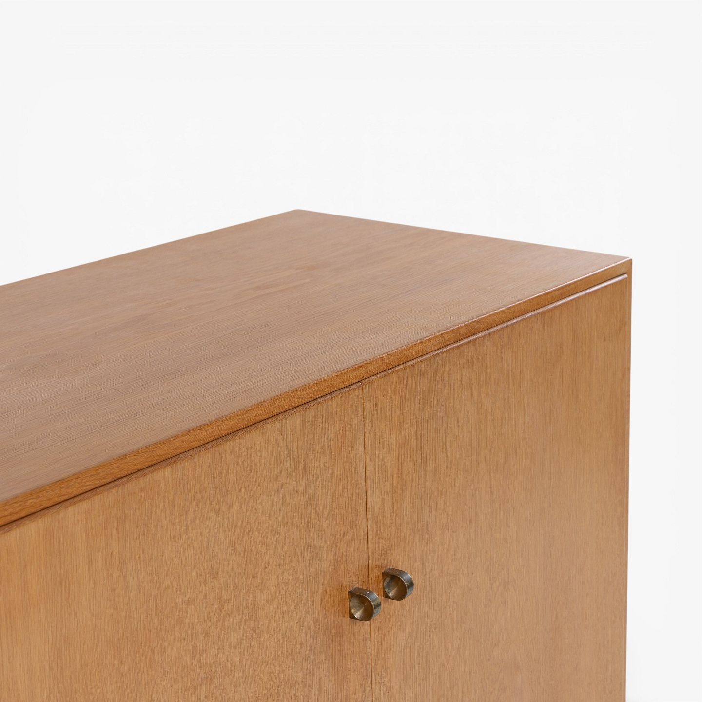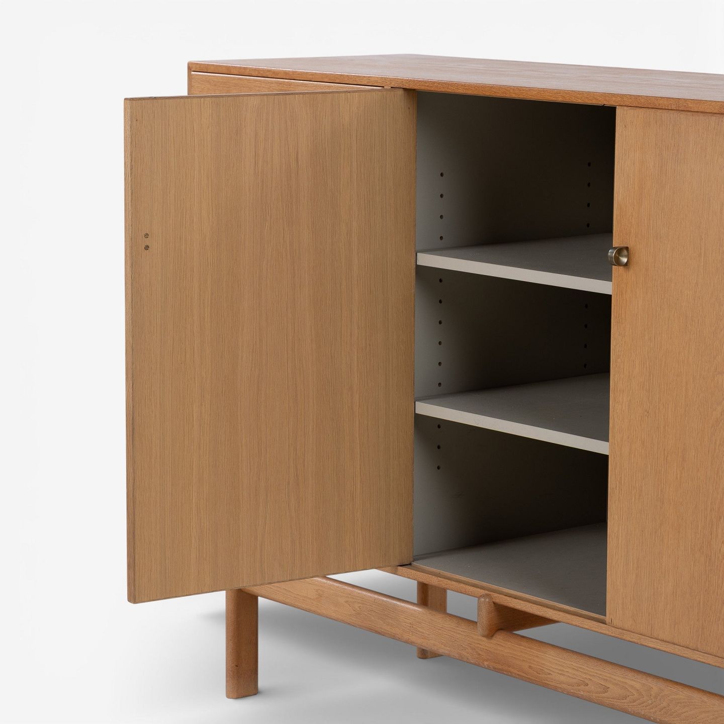 Skænk i patineret egetræ med to låger og otte skuffer m. messinggreb. Stemplet fra producent.