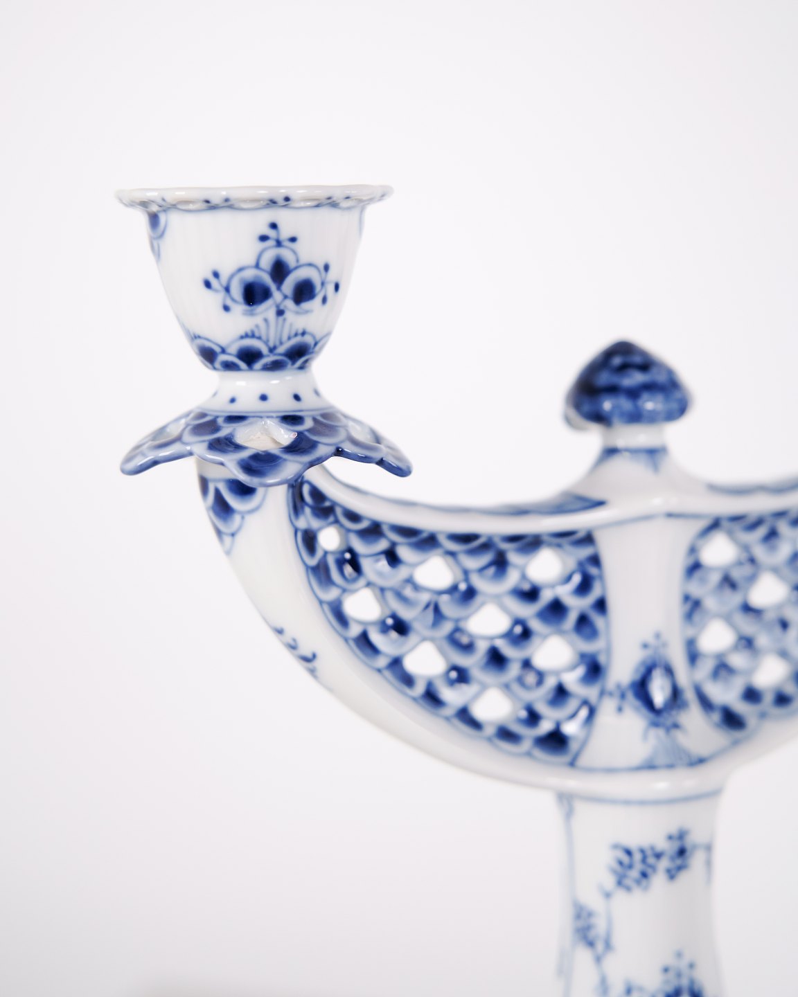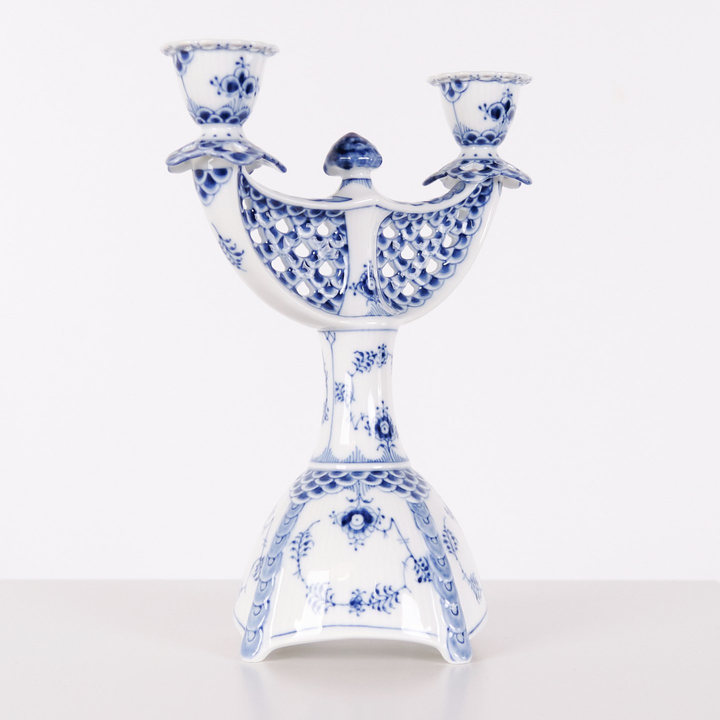 Two-arm candlestick in Blue Fluted Full Lace porcelain, model 1169, produced by Royal Copenhagen. Executed in hand-painted porcelain with the characteristic openwork lace border and underglaze decoration. Produced as first quality and part of Royal Copenhagen’s traditional tableware production.