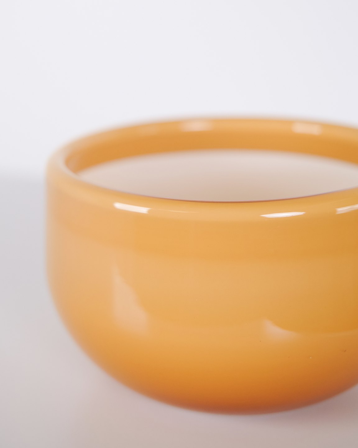 Glasskål fra Palet-serien designet af Michael Bang for Holmegaard. Skålen er udført i mundblæst glas i gul/karamel farvetone, kendetegnet ved Palet-seriens farvearbejde og enkle, funktionelle formsprog. Serien blev produceret hos Holmegaard i anden halvdel af det 20. århundrede og er i dag efterspurgt inden for dansk glasdesign.