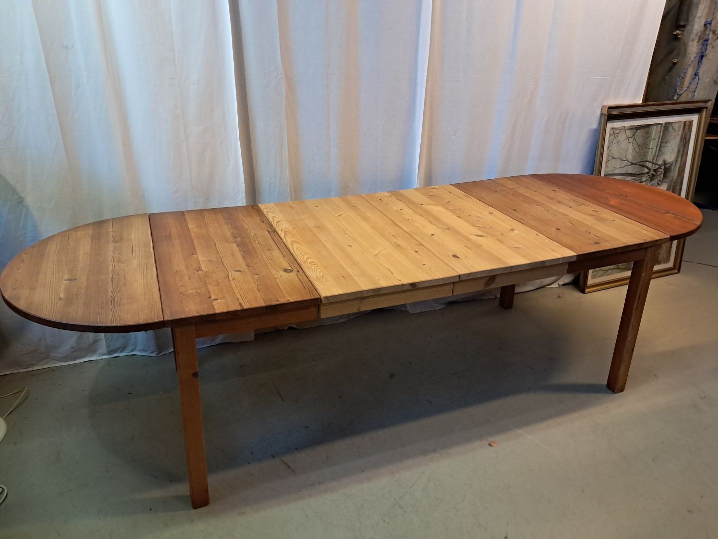 Spisebord i massivt fyrretræ med klapper og 2 tillægsplader, fra 1980erne.