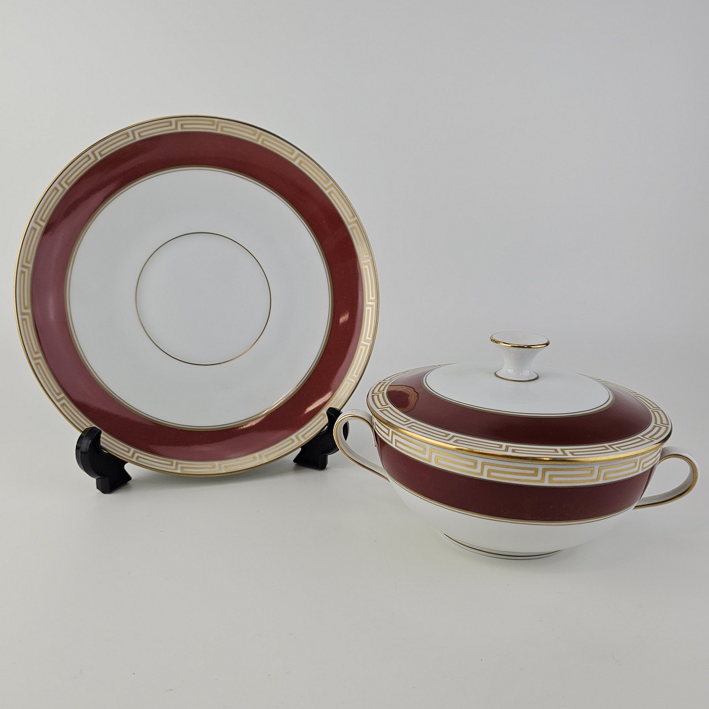 Service i porcelæn med rød bort, græsk inspireret guld bort og guldkant