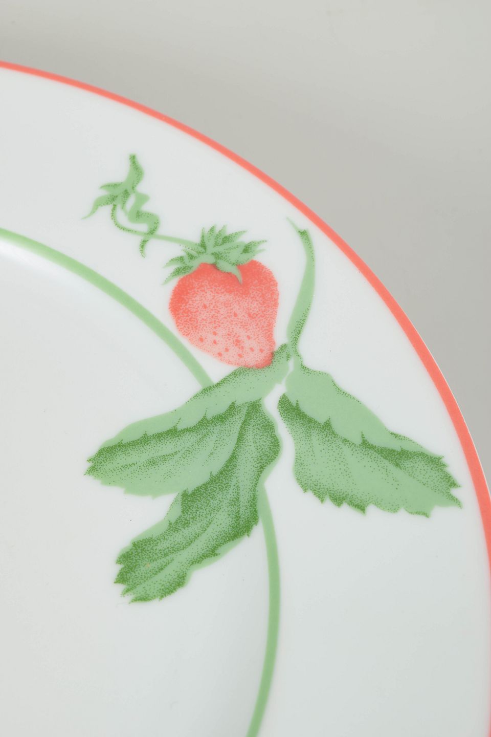 Sæt på fire middagstallerkener i porcelæn med dekoration af jordbær og blade samt grøn og rød kant i serien Fraise.