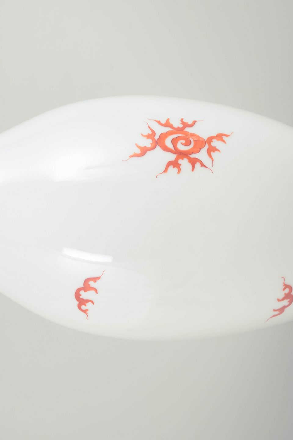 Balusterformet vase i hvidglaseret porcelæn dekoreret med rød Mingdrage og forgyldt kant. Modellen er fremstillet i Meissen-området og er ikke produceret af den kongelige Meissen-manufaktur.