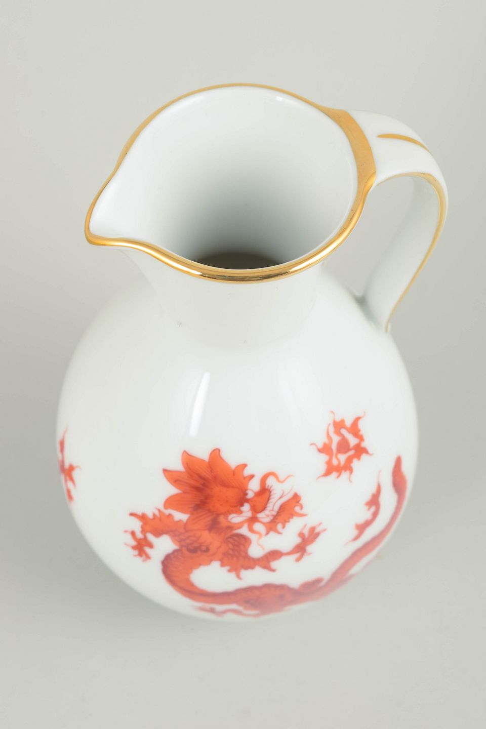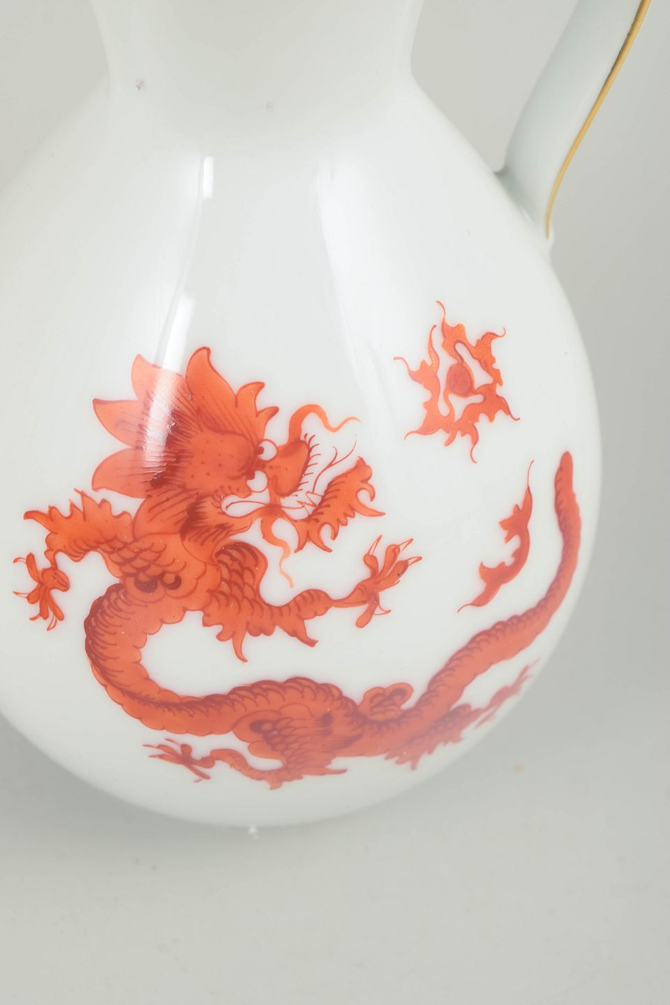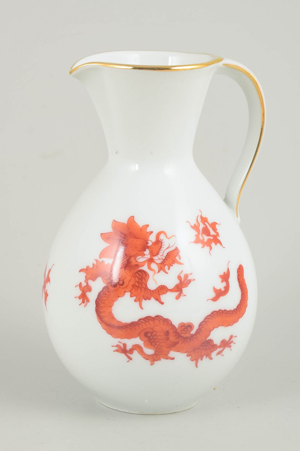 Balusterformet kande i hvidglaseret porcelæn dekoreret med rød Mingdrage og forgyldt kant. Modellen er fremstillet i Meissen-området og er ikke produceret af den kongelige Meissen-manufaktur.