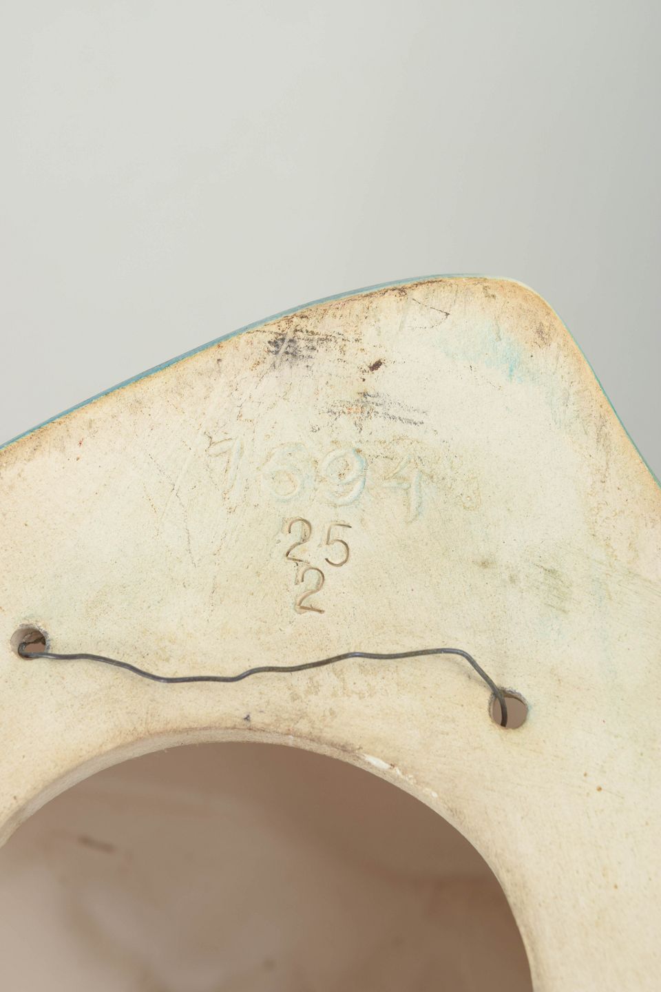 Art Deco vægmaske i glaseret keramik formet som et ansigt; model “Padany”, modelnr. 1694. Stemplet “Wien Keramos” og “Made in Austria”.