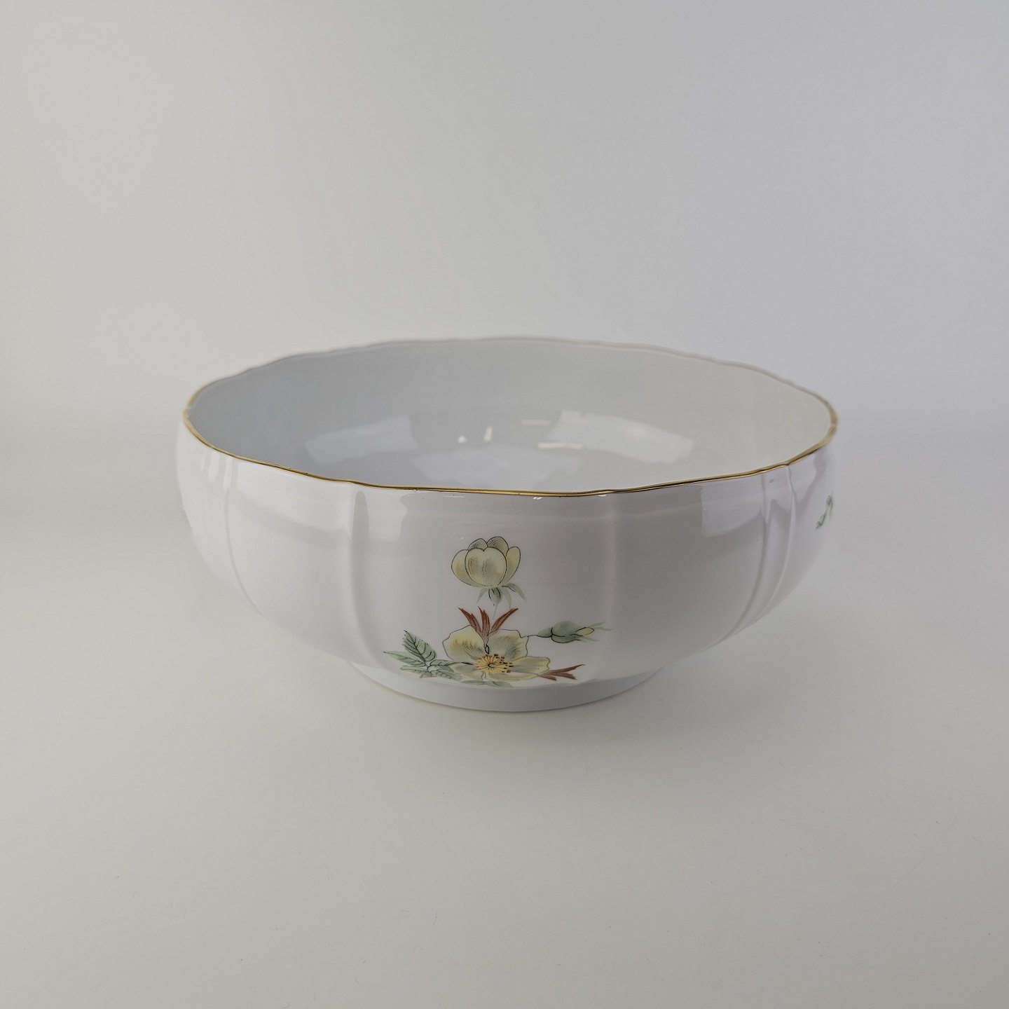 Service i glat hvidt porcelæn med lige knækkede kanter dekoreret med gule blomster og gylden kant
