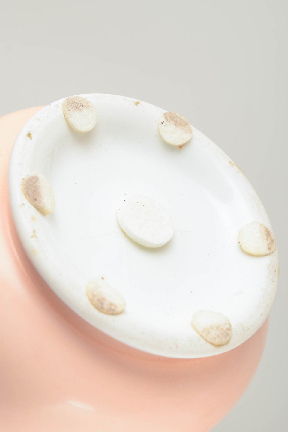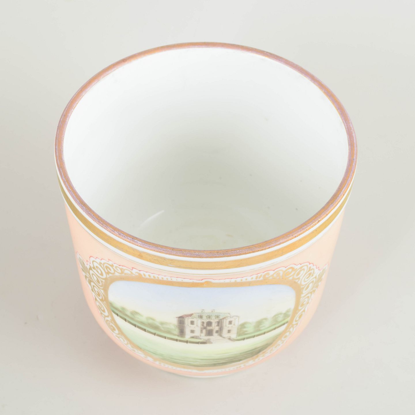 Rund, let konisk vase i porcelæn med opaliserende rosa bundfarve og håndmalet prospekt af Erimitageslottet & Kronborg Slot i et ornamenteret felt med forgyldt bort langs randen. Klassicistisk inspireret form med lav fodring. Motiv udført i fine pastelfarver med arkitektoniske detaljer.
