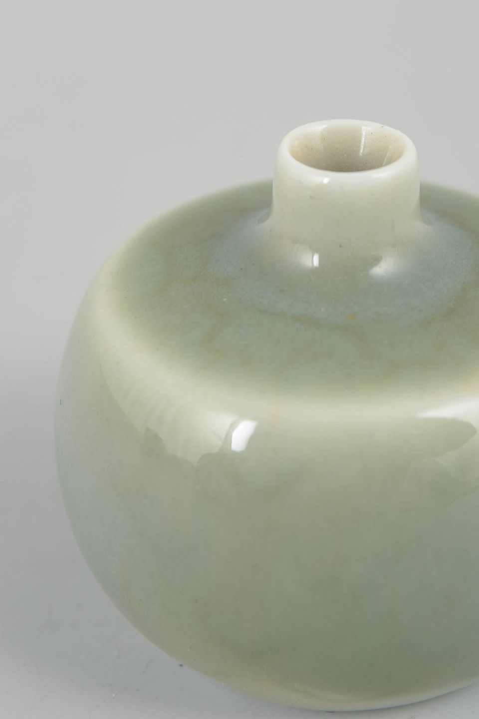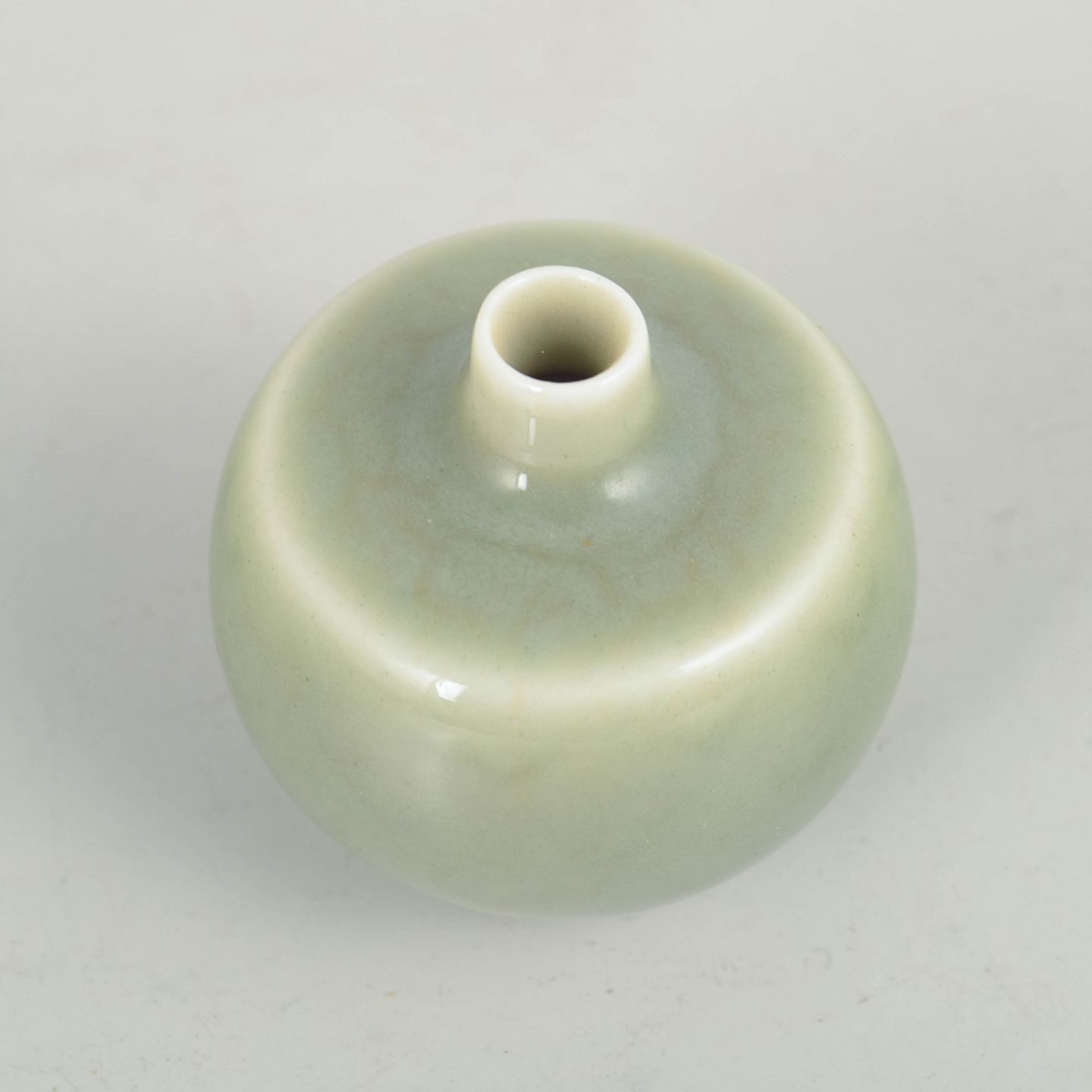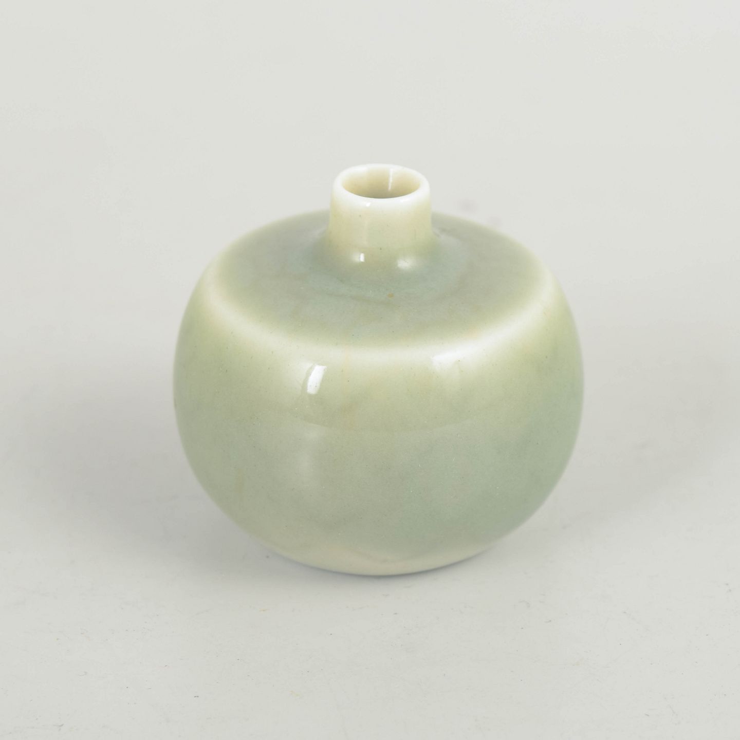 Lille rund vase i stentøj med blødt afrundet form og ensfarvet celadonglasur i lysegrøn tone. Glasuren har en rolig, silkemat overflade med lette nuancevariationer, typisk for Stålhane’s stramme og harmoniske formsprog.