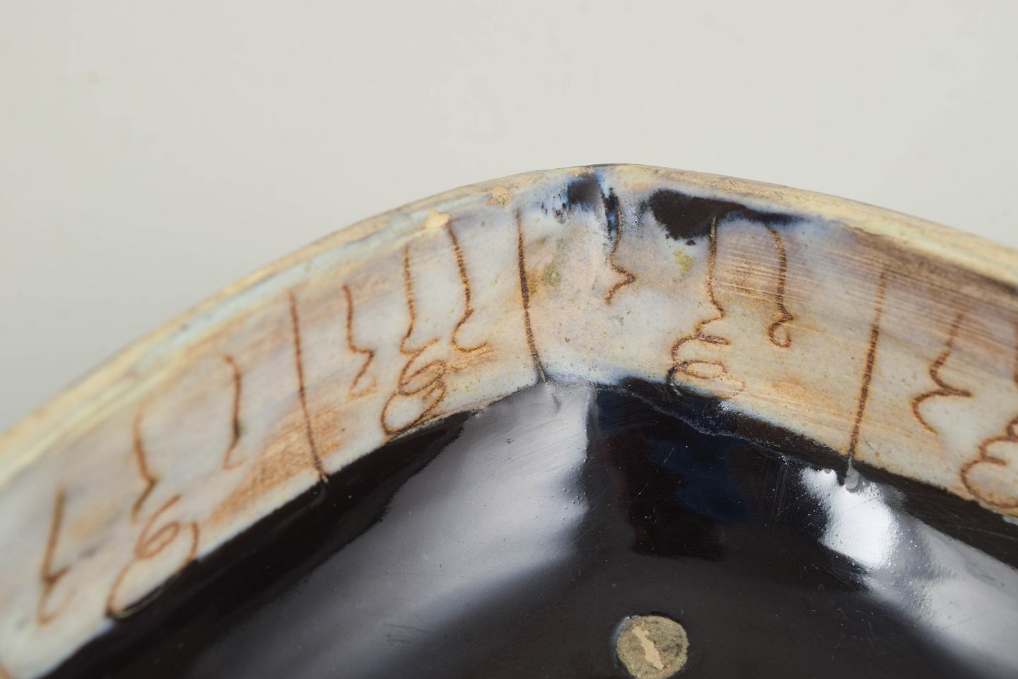 Organisk formet keramisk skål med asymmetrisk/let facetteret åbning. Mørk, blank glasur udvendigt og lys inderside med dryppede, brunlige glasurspor og fint krakeleret udtryk.
