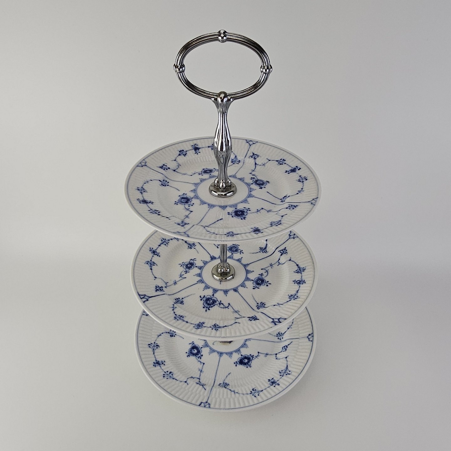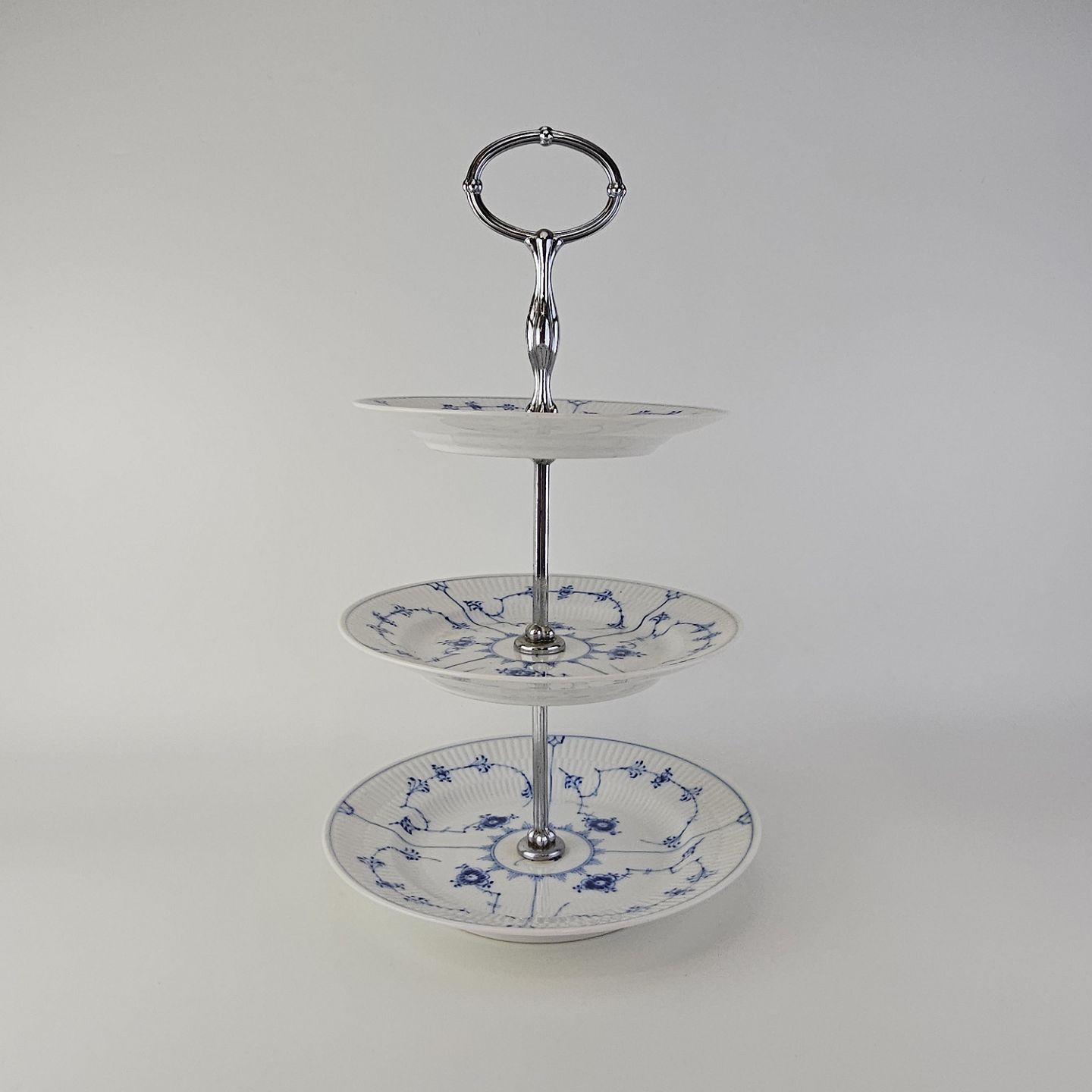 Kageopsats i tre lag i kongeligt porcelæn fra stellet Musselmalet riflet.
