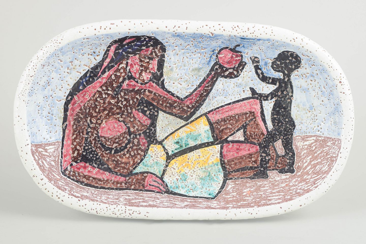 Unikt figurativt vægrelief i glaseret stentøj med stiliseret mor- og barnemotiv udført i kraftige jordfarver og kontrasterende konturtegning.