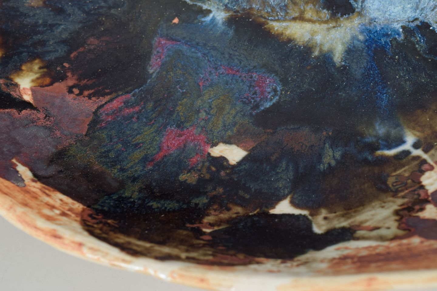 Unik, organisk formet skål i drejet stentøj med levende, abstrakt dekoration og flerfarvet glasur i jordfarver og blålige nuancer.