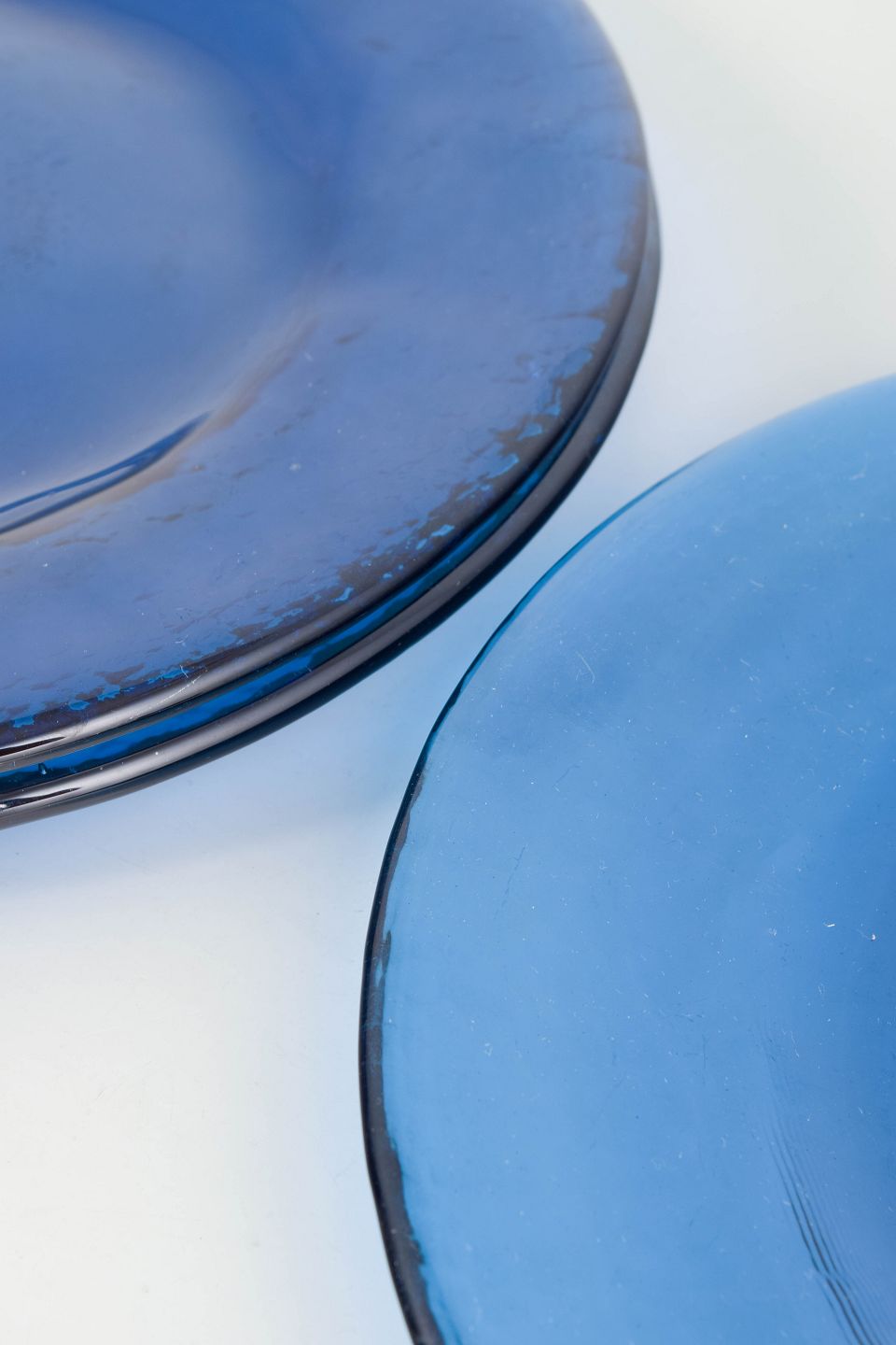 Sæt med tre svenske tallerkener i kraftigt blæst kunstglas i blå nuancer, udført med glat spejl og let ujævn rand, typisk for skandinavisk glasdesign fra midten af det 20. århundrede.