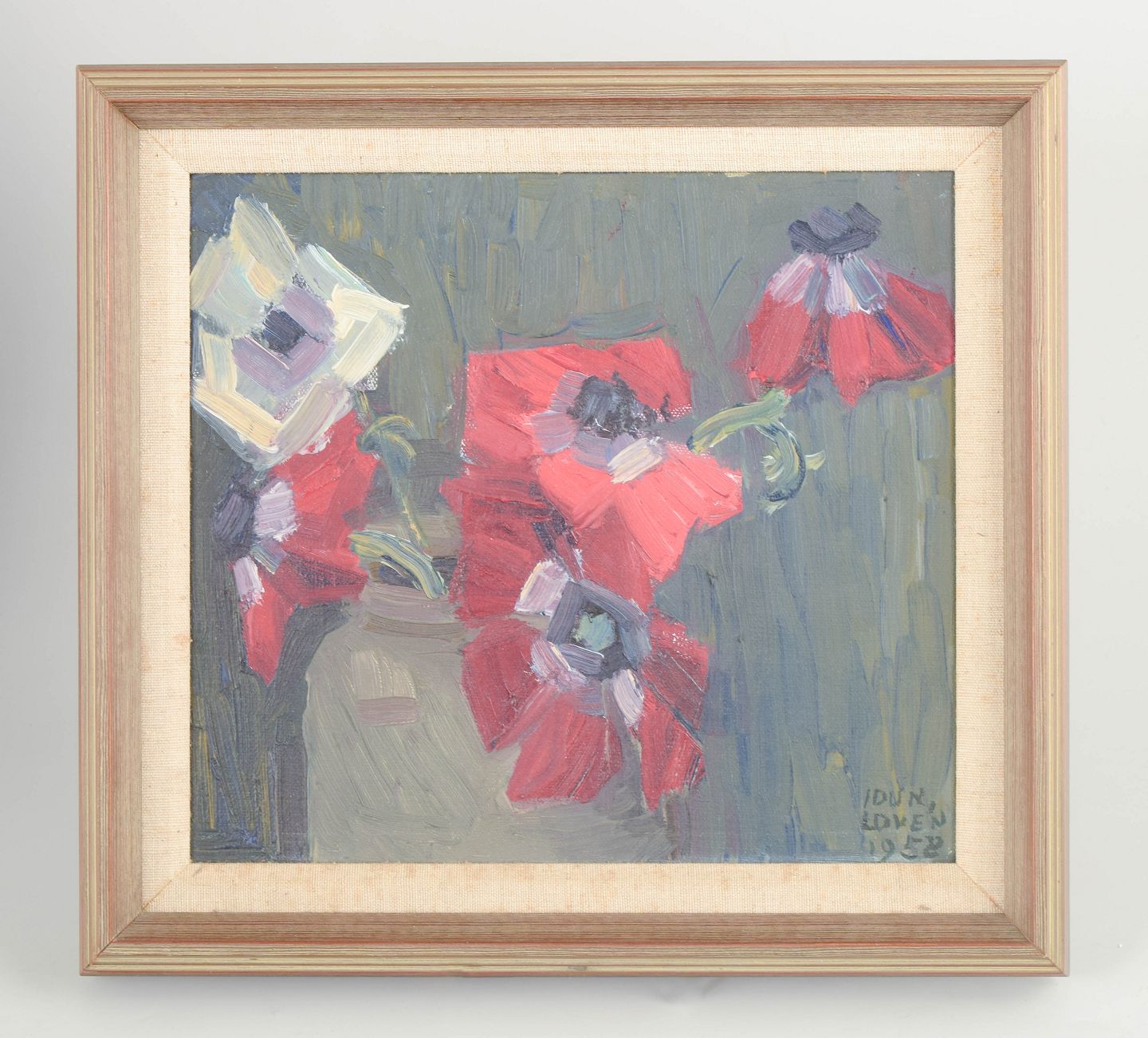 Blomstermotiv udført i et frit og malerisk formsprog med tydelige penselstrøg og en afdæmpet baggrund, der fremhæver de røde og lyse blomsterformer. Signeret og dateret 1958.
